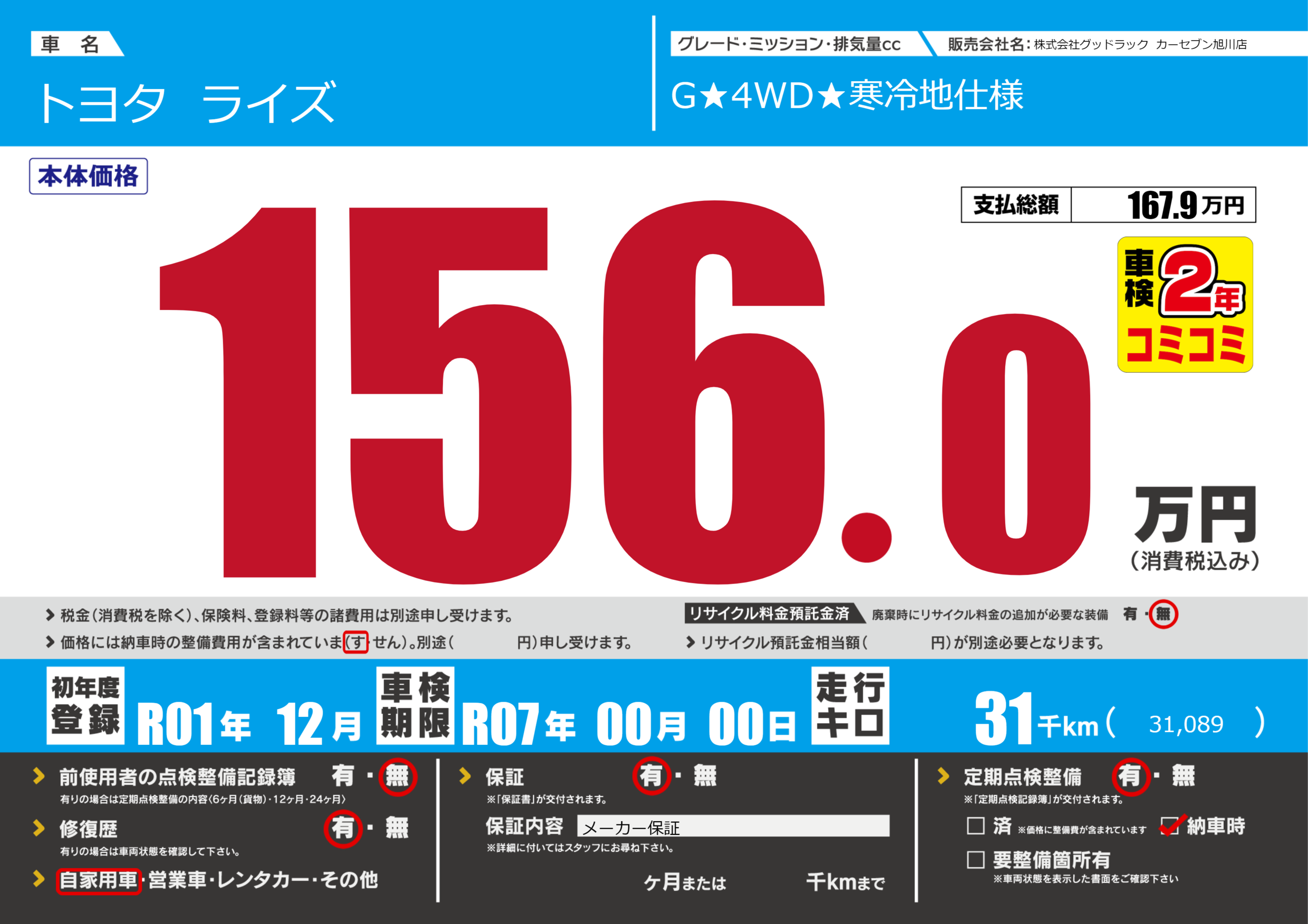 | 車検制限 | R07年 00月 00日 | ||