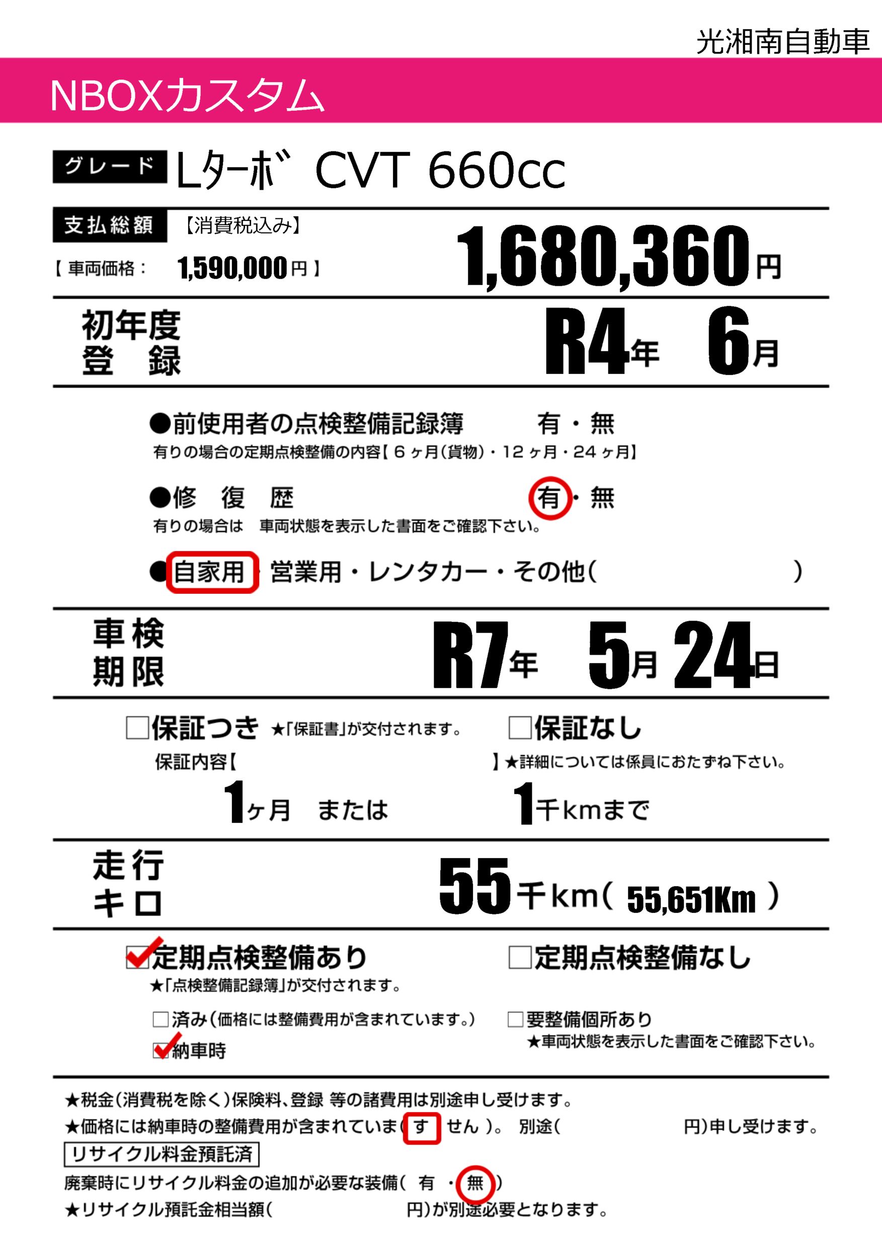 | 車名 | NBOXカスタム | グレード ミッション 排気量 |