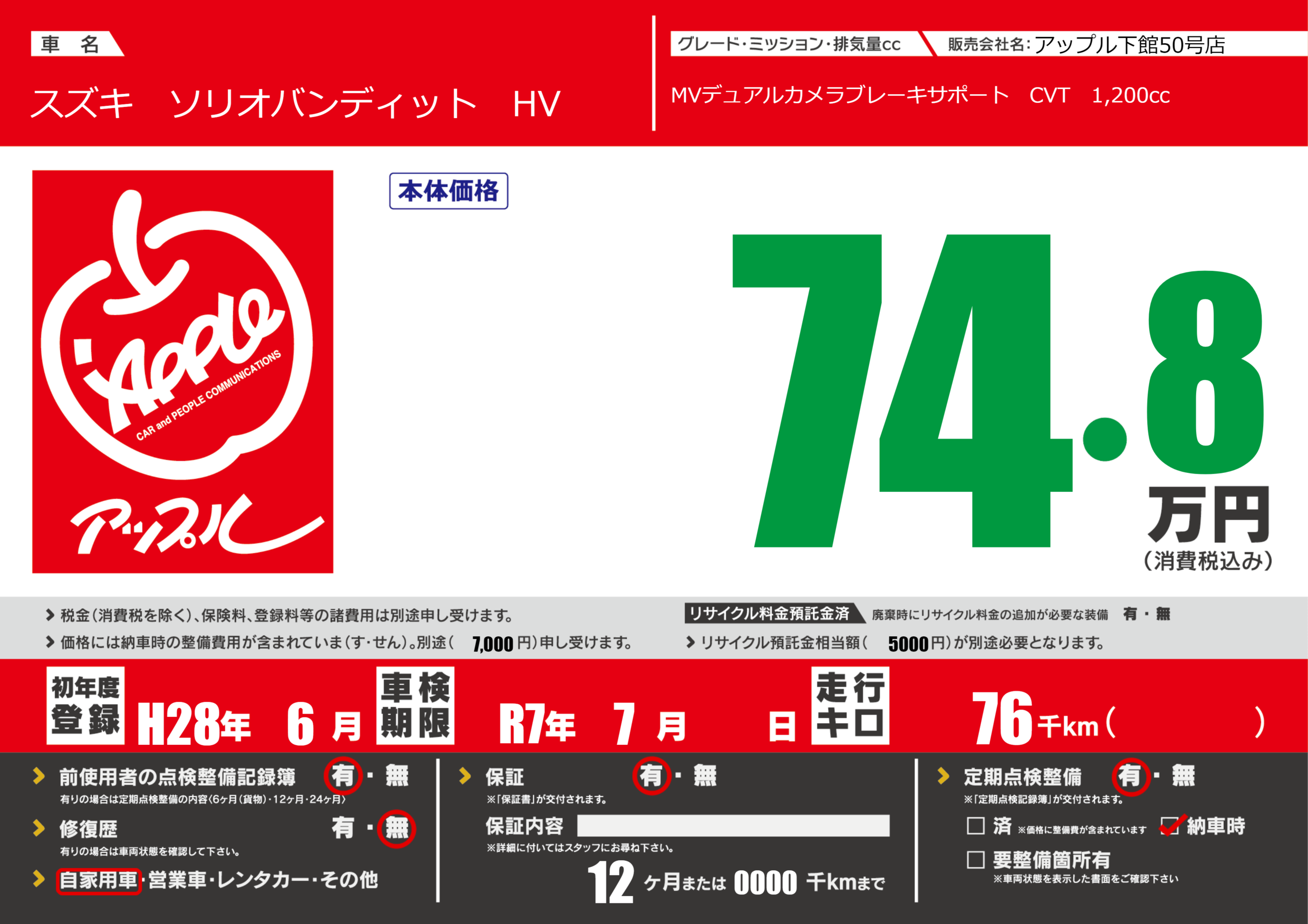 | 定期点検整備 | 定期点検整備あり 納車時あり | ||