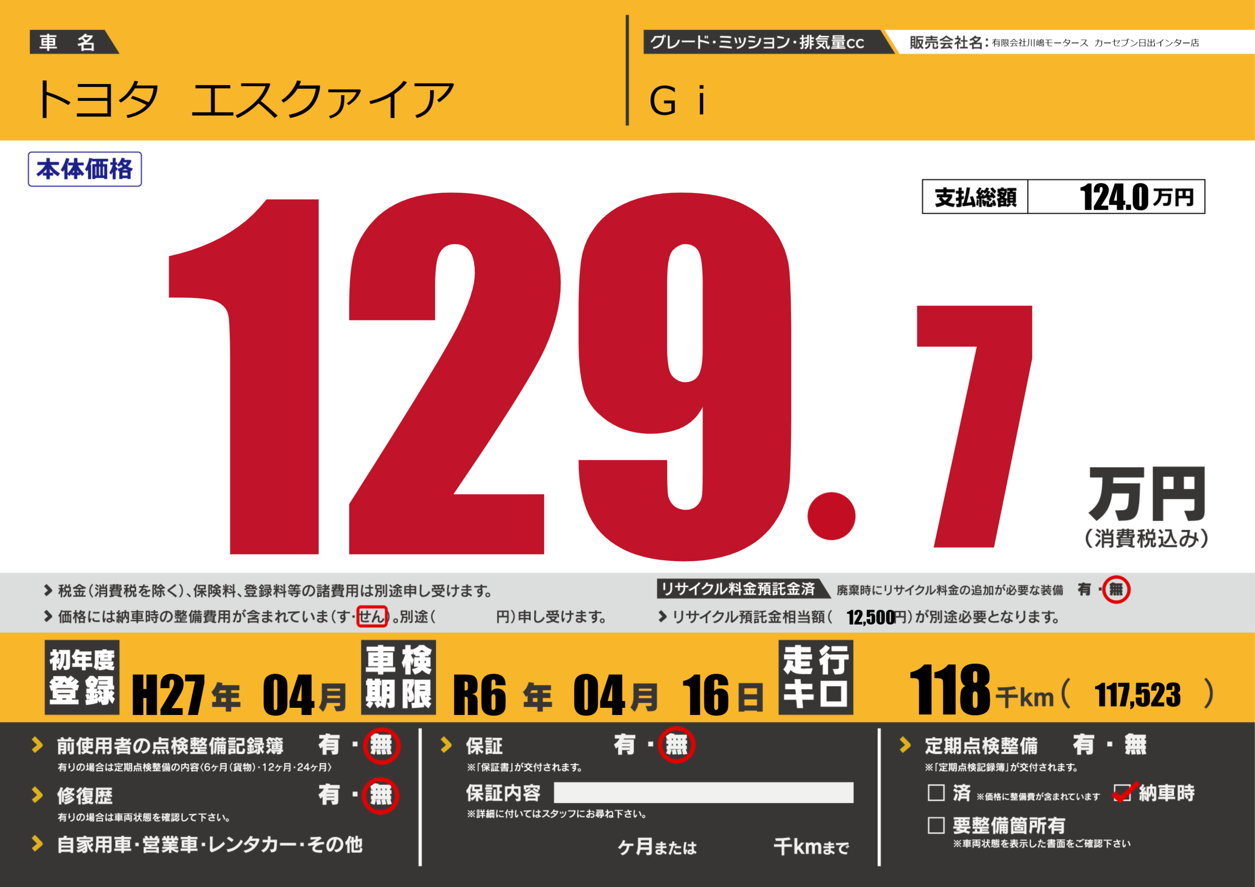 なし | 車検制限 | R6年04月16月 |
