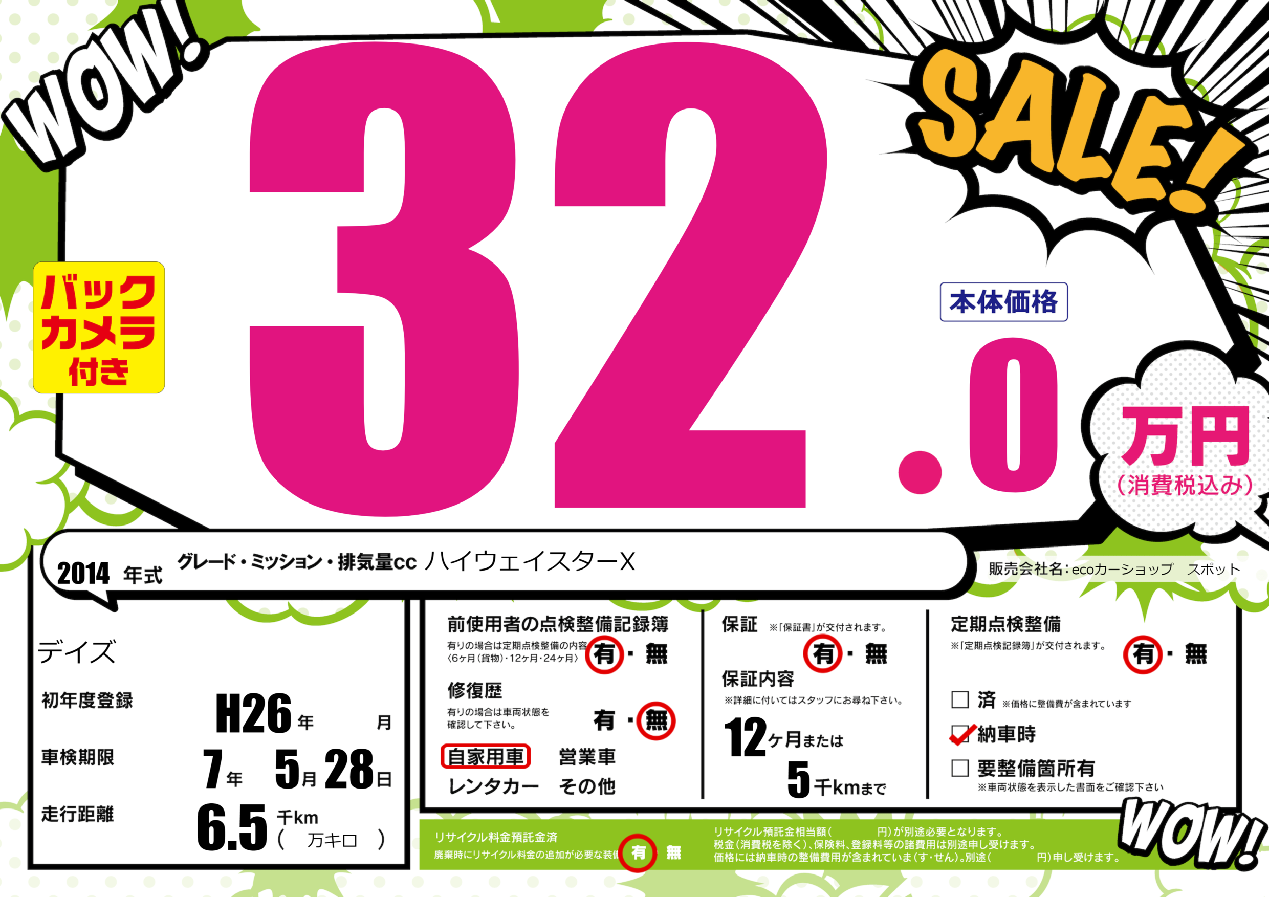 | 走行キロ | 0.6万km | 初年度登録 | H26年---月 |