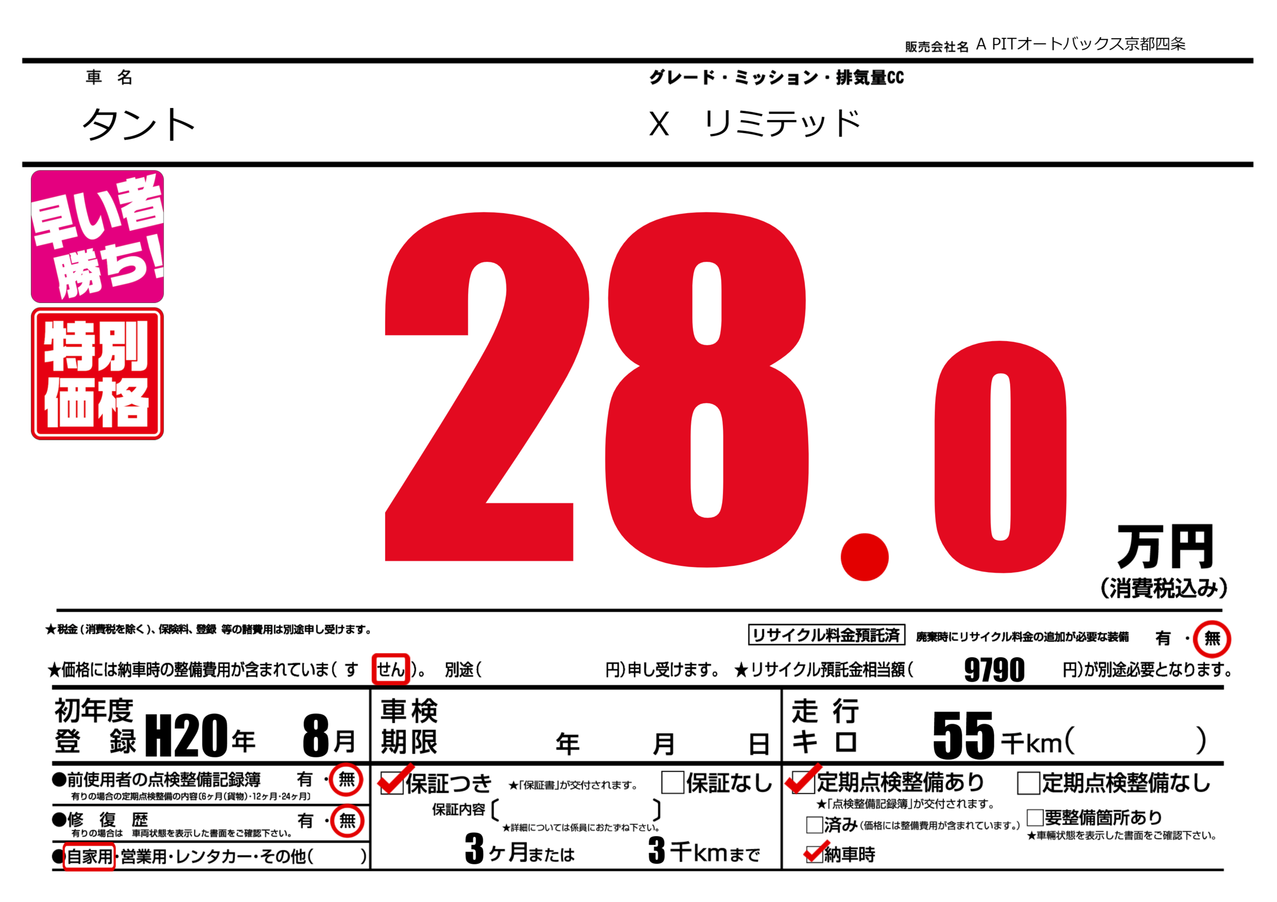 保証なし 保証内容(---) 3ヶ月または(3)千kmまで |