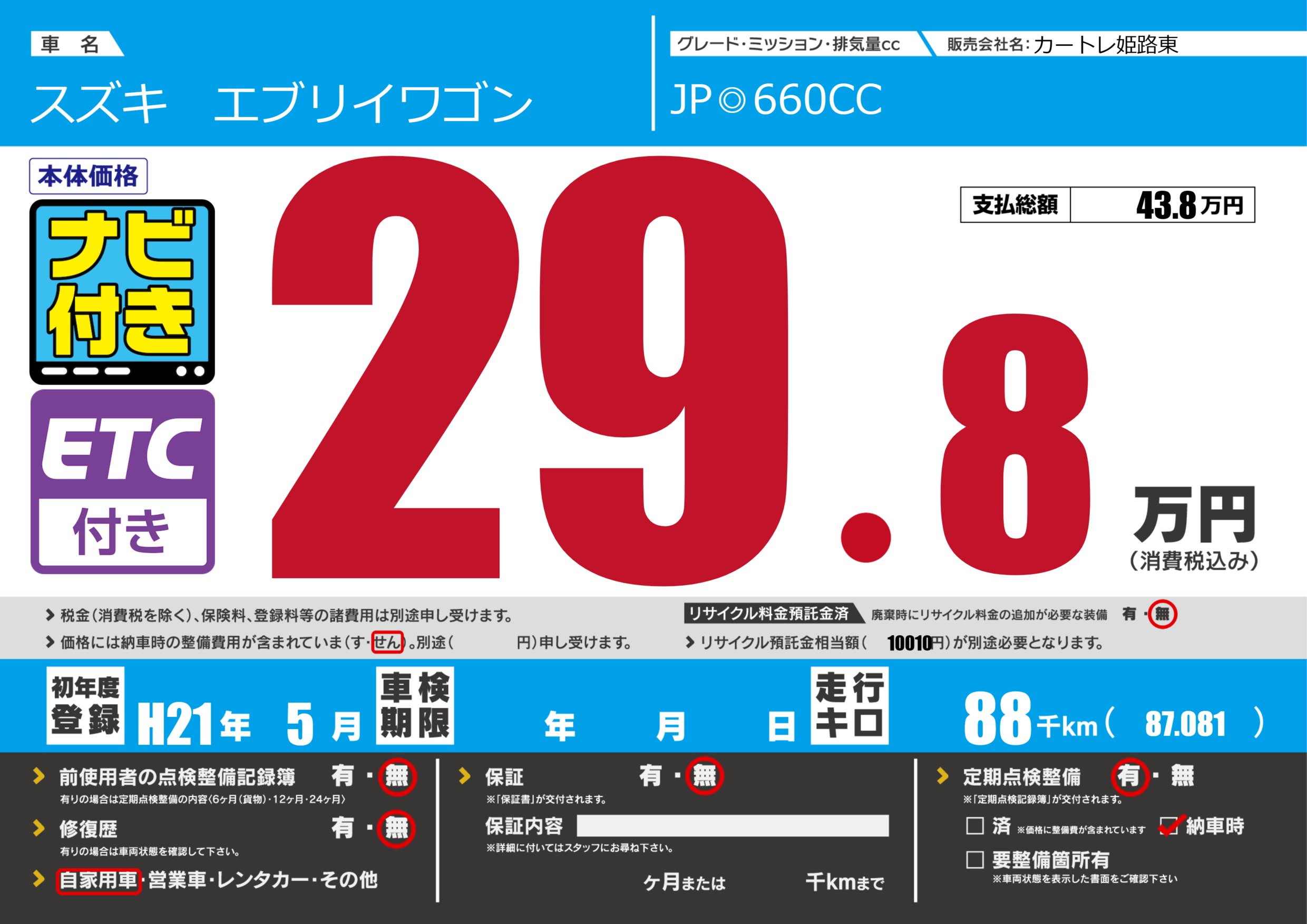 | 定期点検整備 | 定期点検整備あり 納車時あり | ||