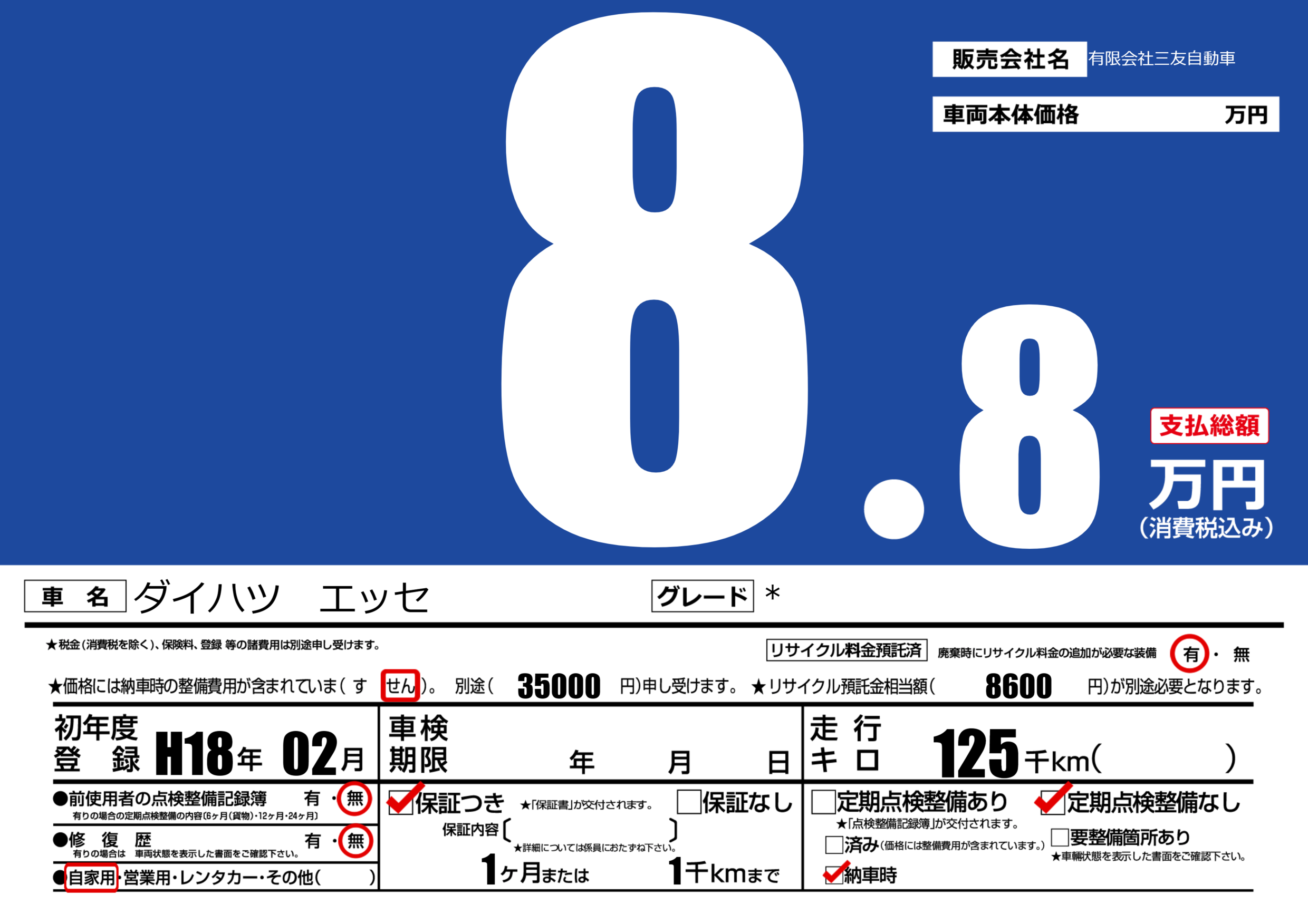 | 定期点検整備 | 定期点検整備なし 納車時あり | ||
