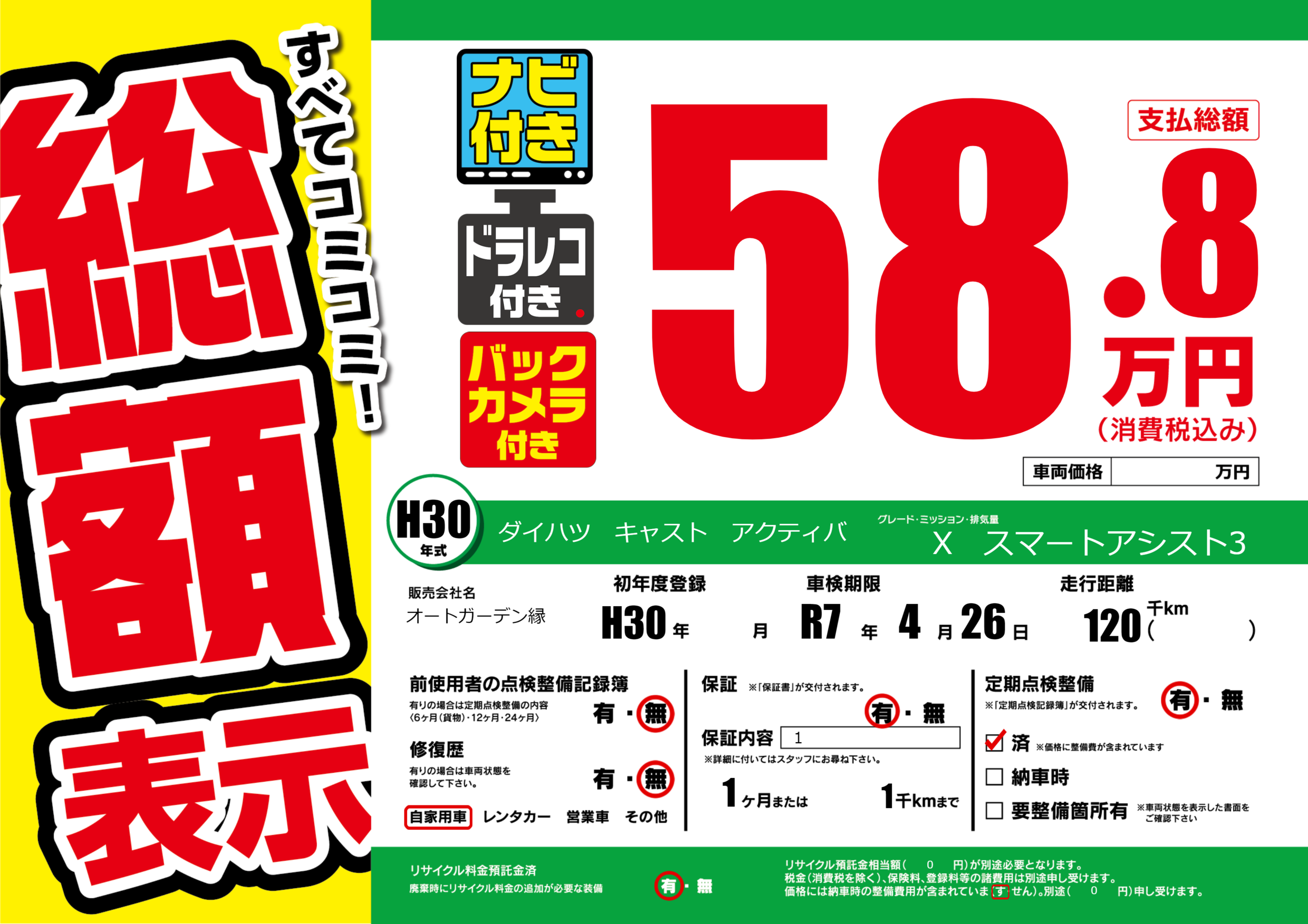 | 定期点検整備 | 定期点検整備あり 定期点検整備済み | ||
