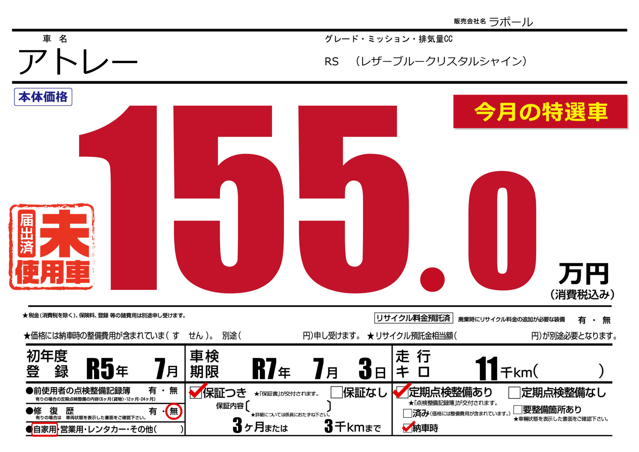 | 走行キロ | 1.1万km | 初年度登録 | R5年7月 |