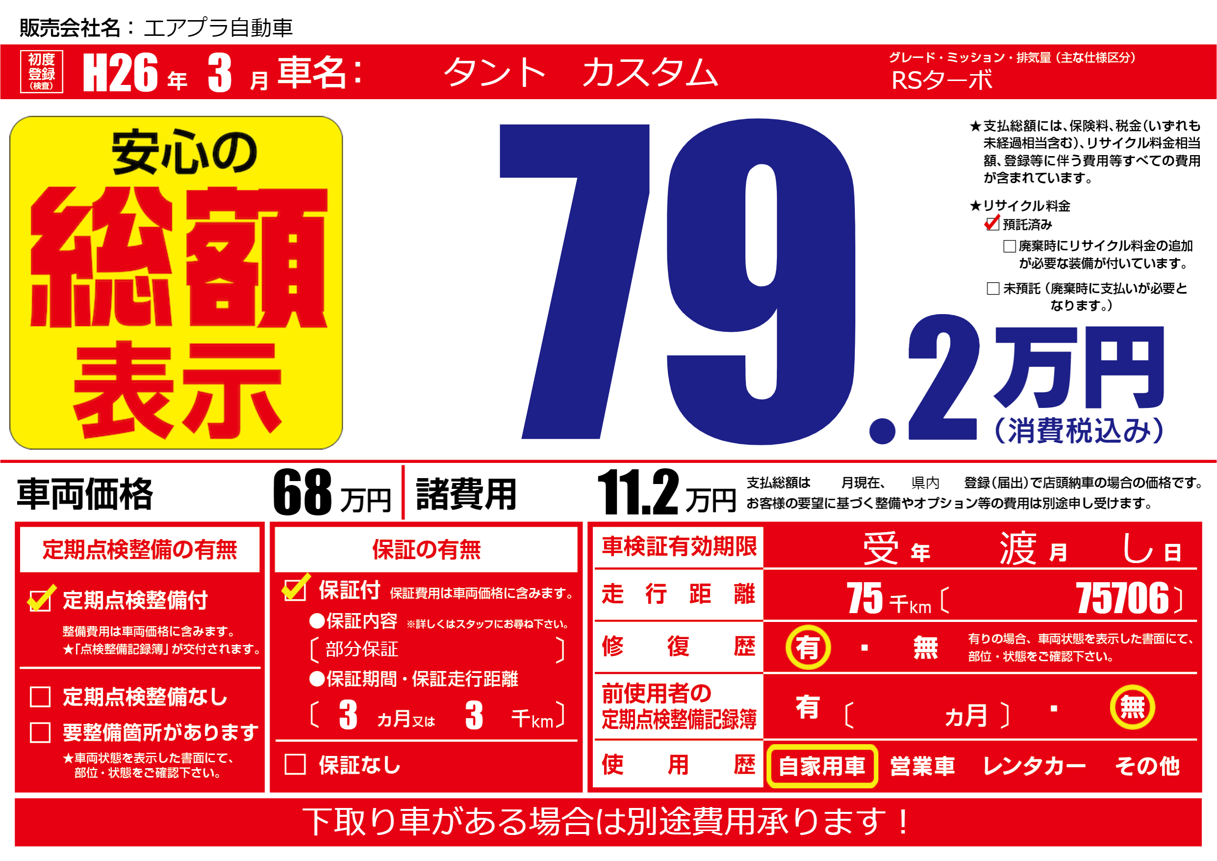 | 車名 | タント カスタム | グレード ミッション 排気量 |