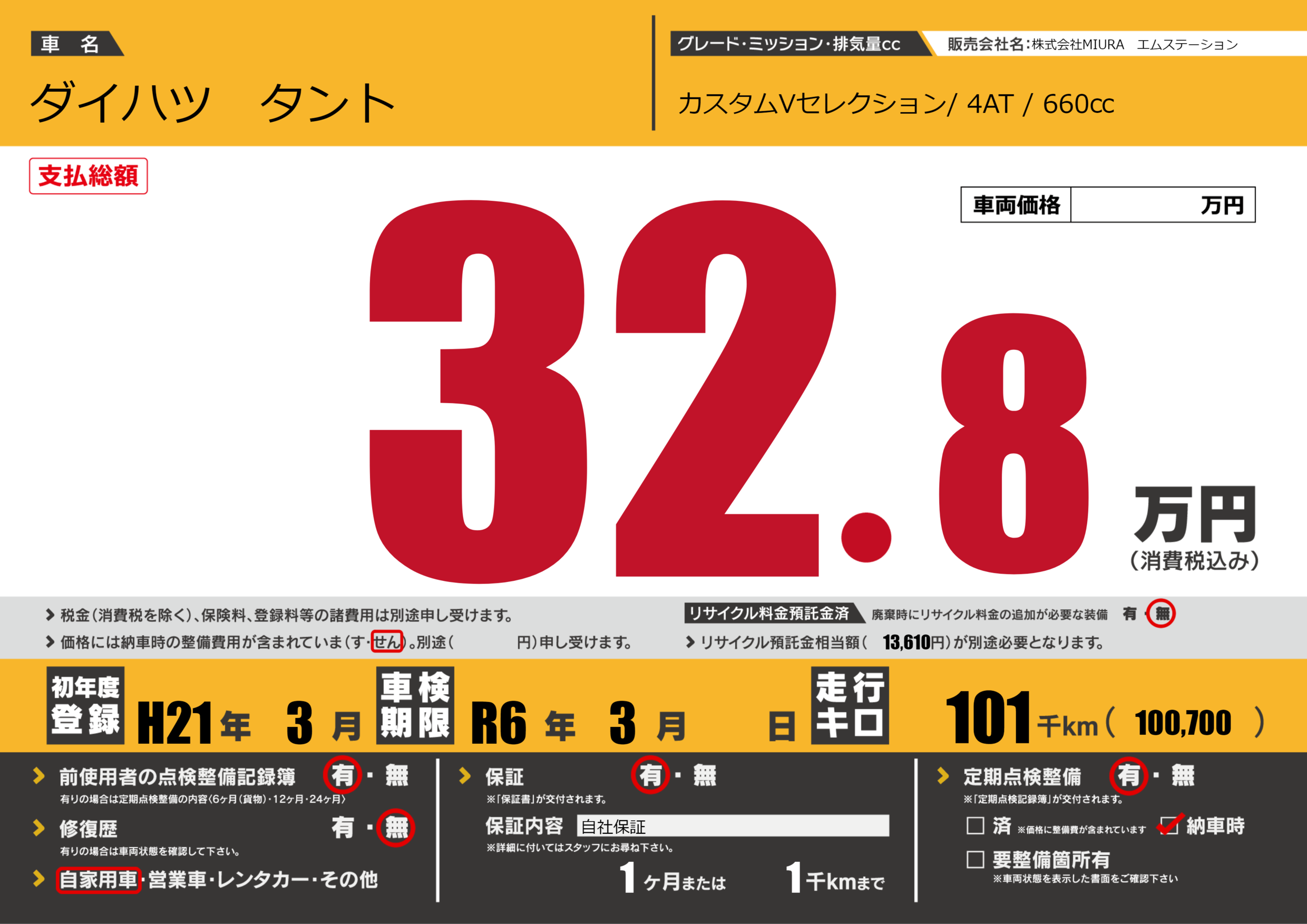 | 車名 | ダイハツ タント | グレード ミッション 排気量 |