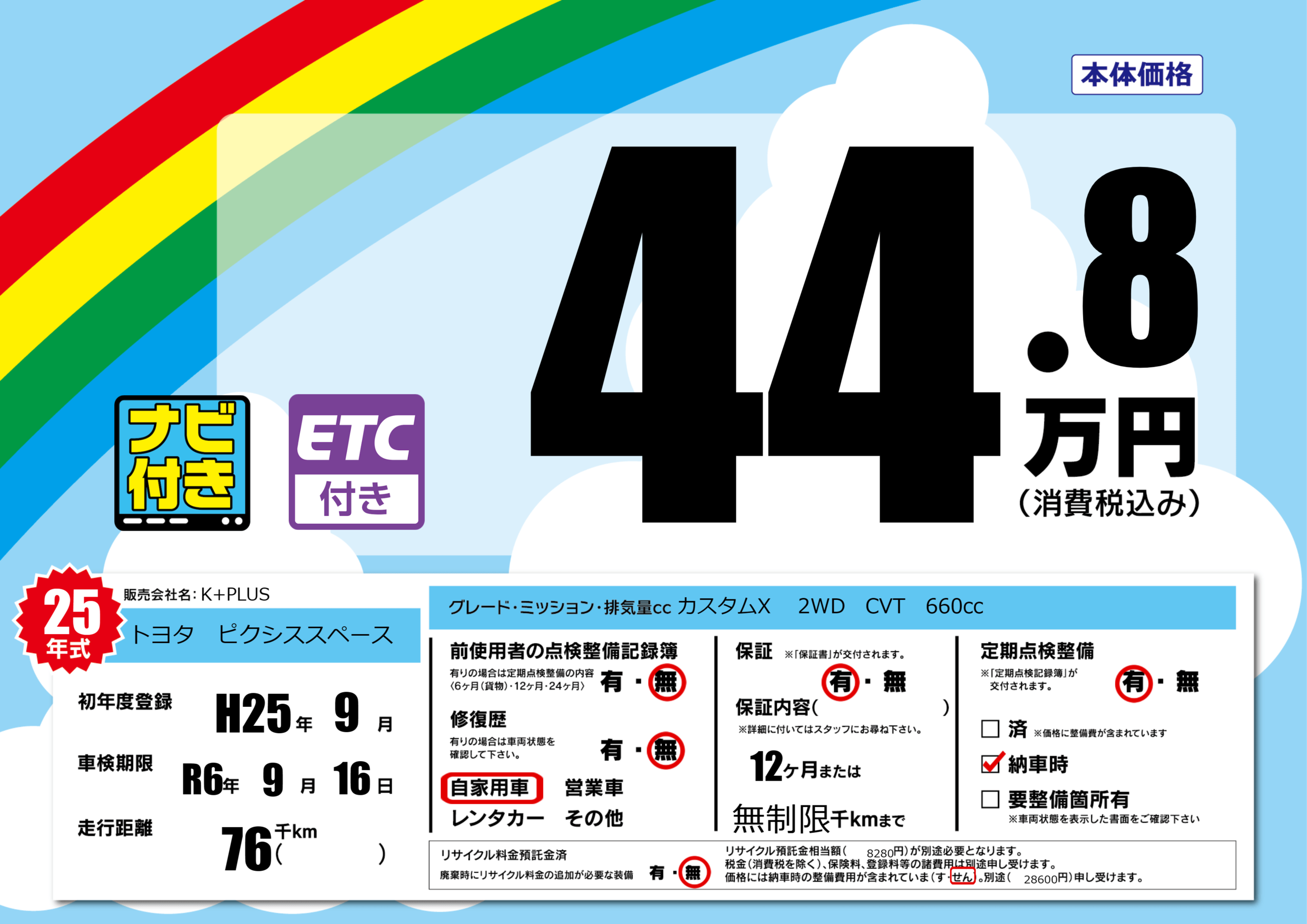 | 定期点検整備 | 定期点検整備あり 納車時あり | ||
