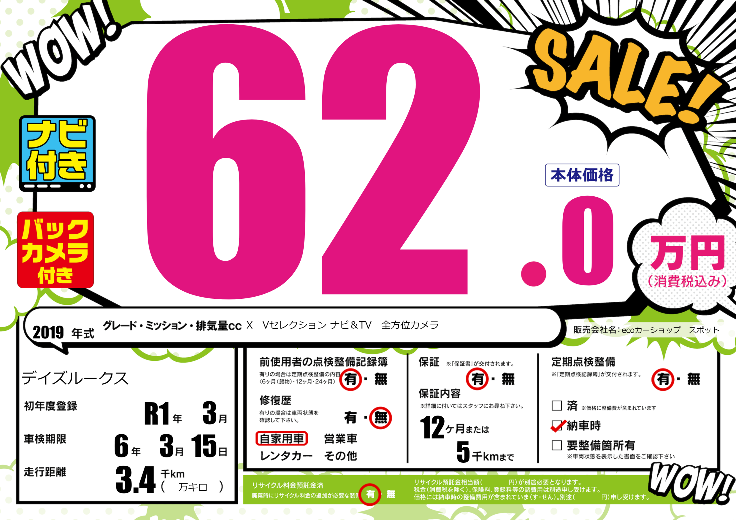 | 車名 | デイズルークス | グレード ミッション 排気量 |