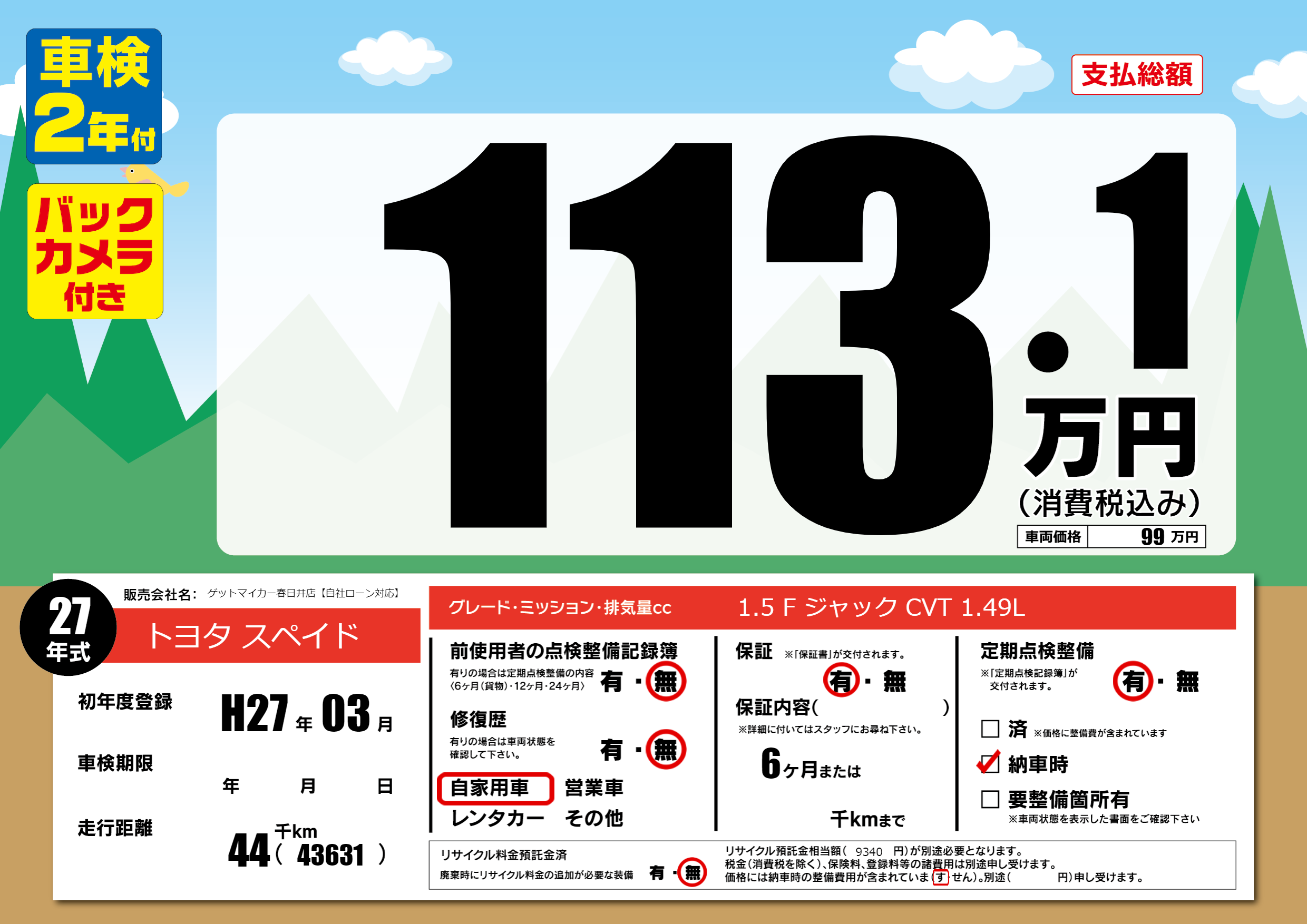 | 走行キロ | 4.4万km | 初年度登録 | H27年03月 |