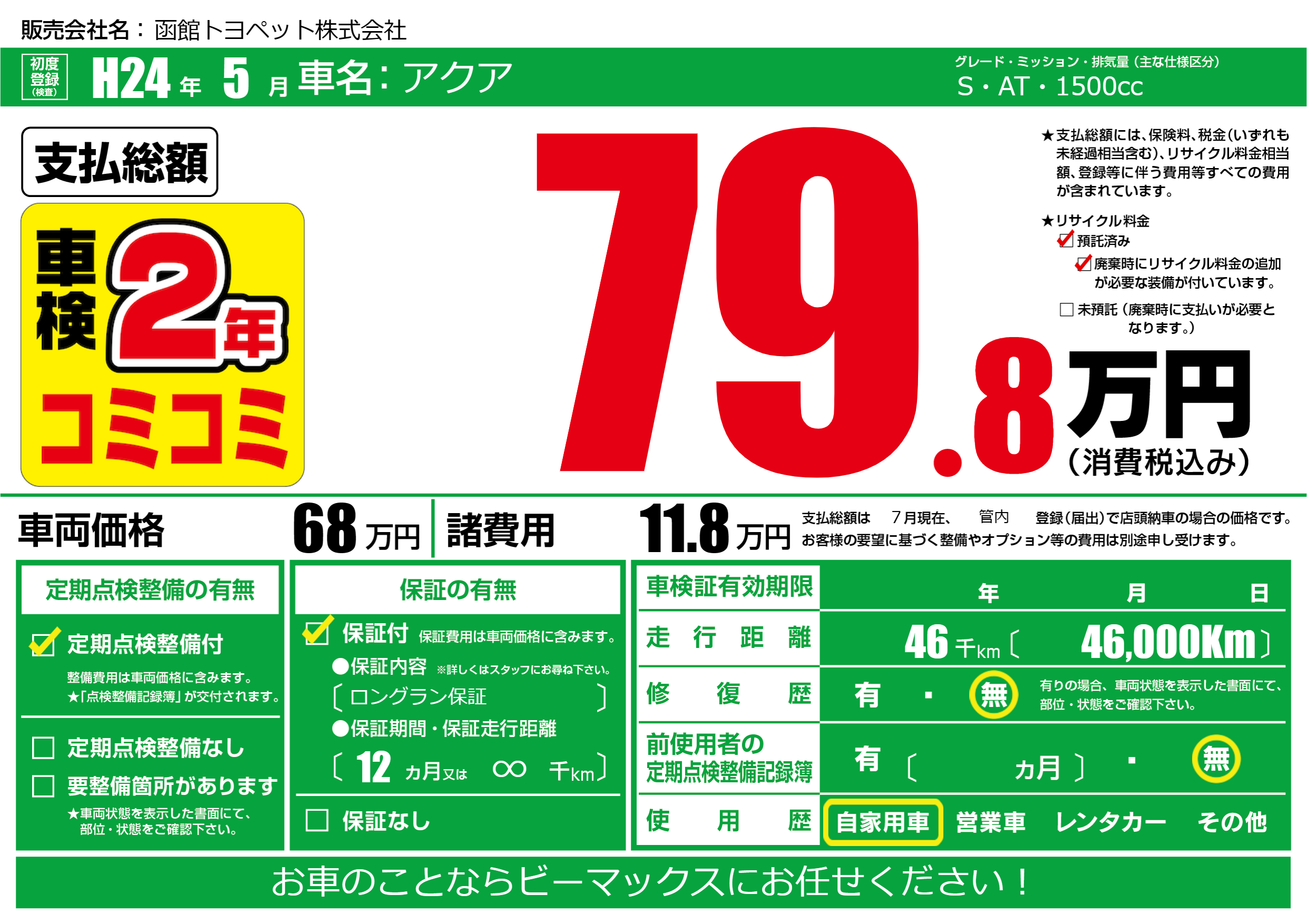 | 走行キロ | 4.6万km | 初年度登録 | H24年5月 |