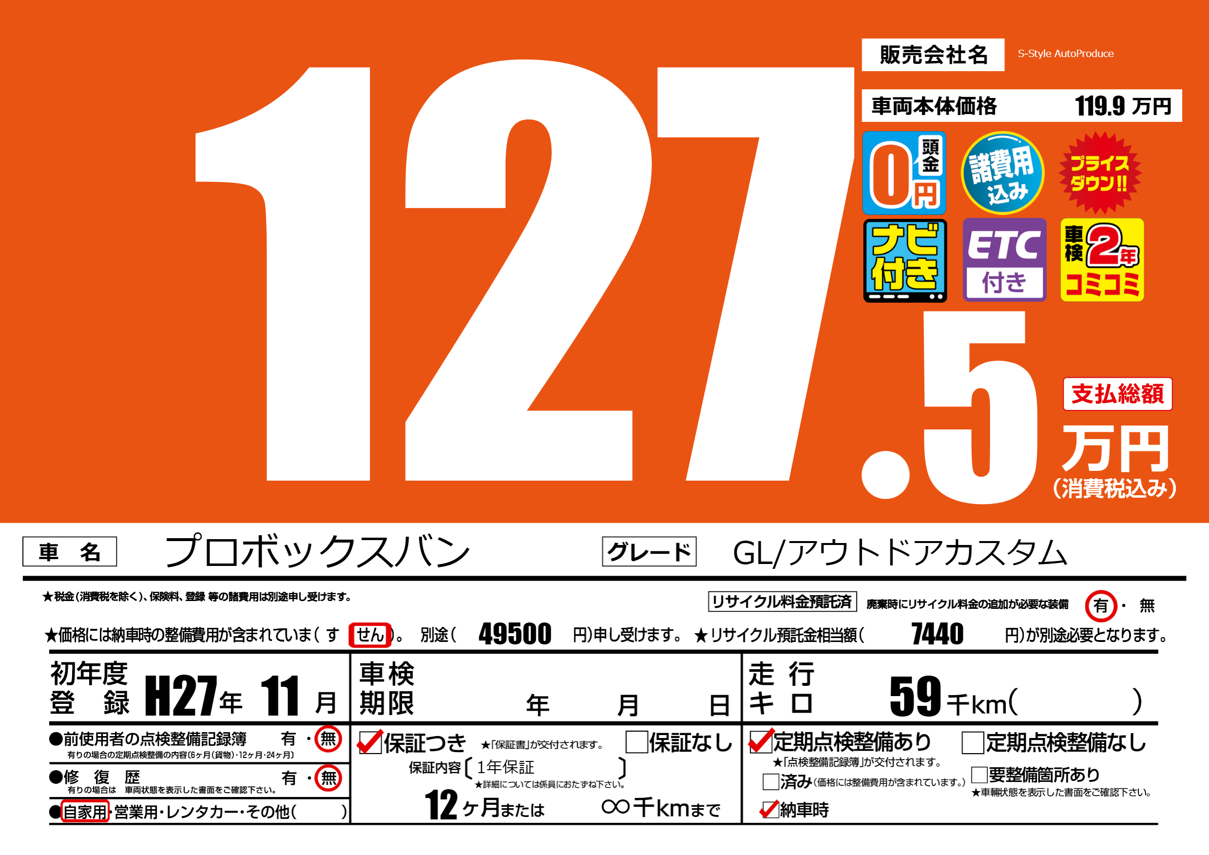 | 車名 | プロボックスバン | グレード ミッション 排気量 |