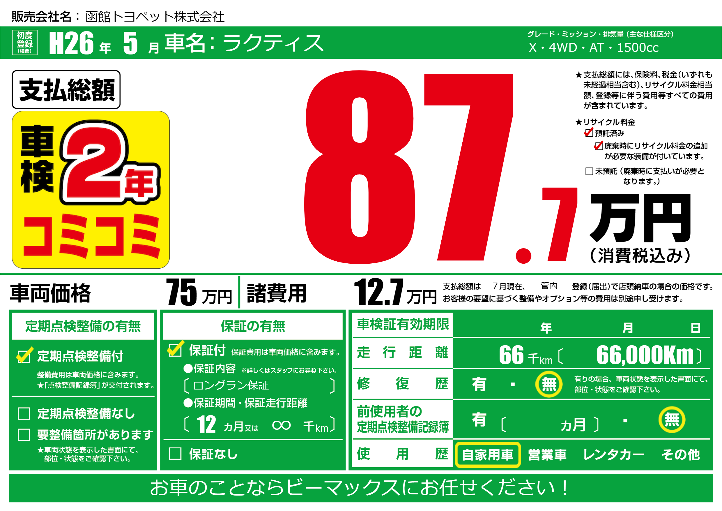 | 車名 | ラクティス | グレード ミッション 排気量 |