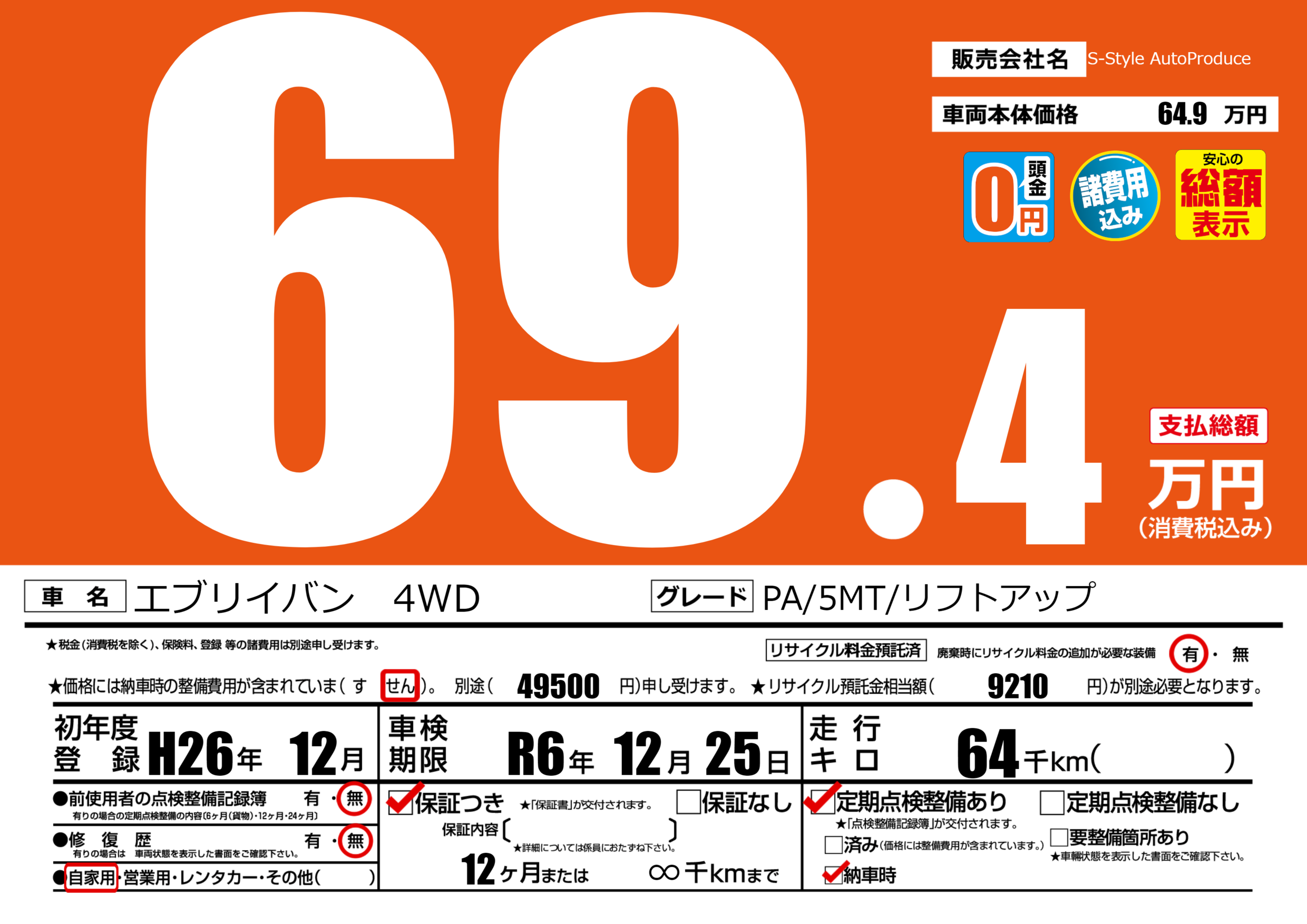 | 車名 | エブリイバン 4WD | グレード ミッション 排気量 |