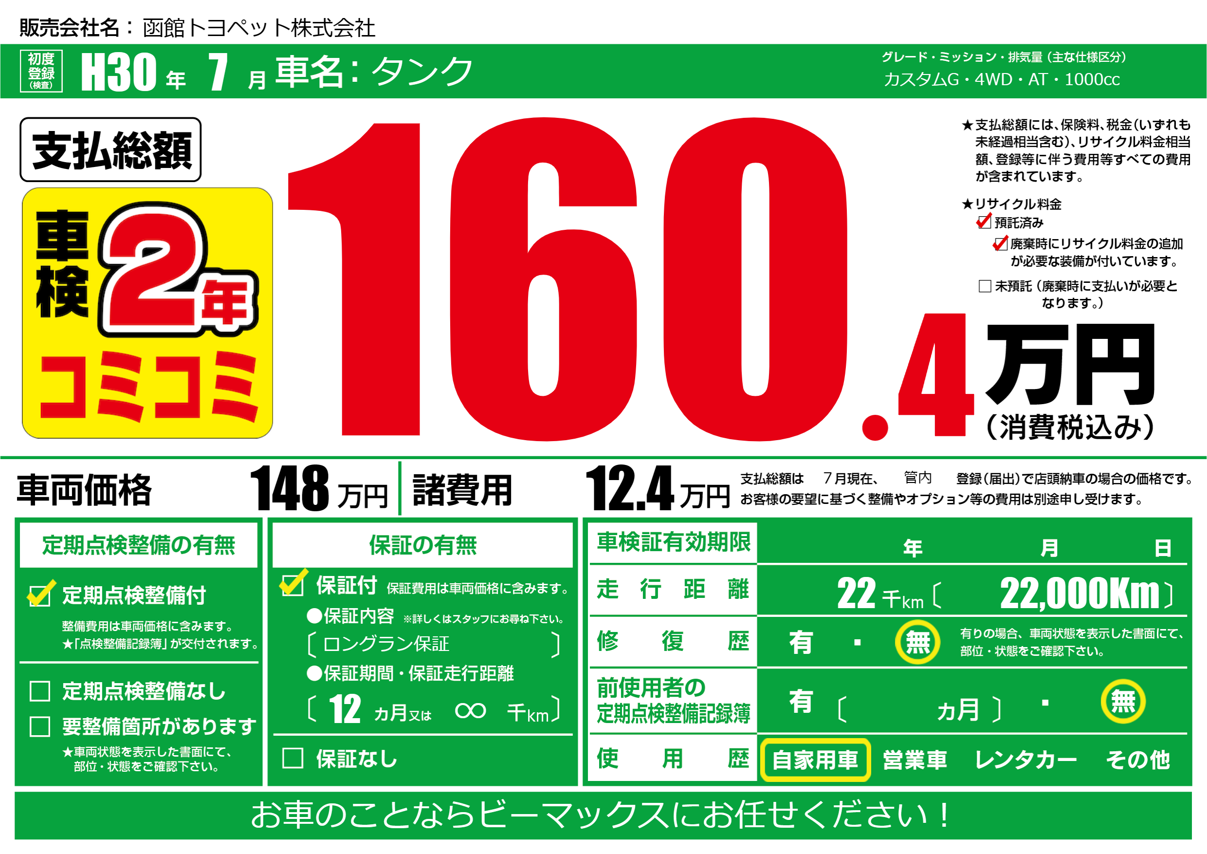 | 走行キロ | 2.2万km | 初年度登録 | H30年7月 |