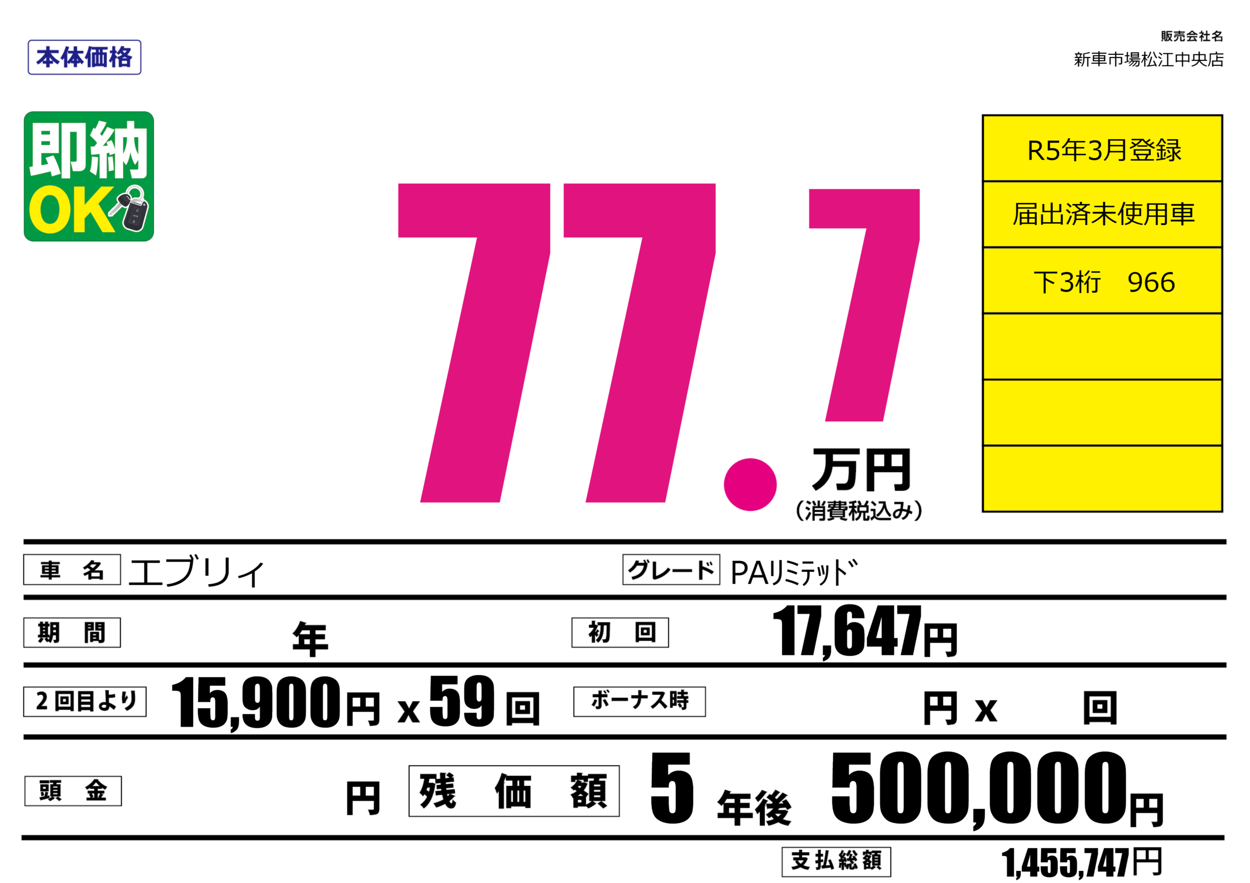 | 車名 | エブリィ | グレード ミッション 排気量 |