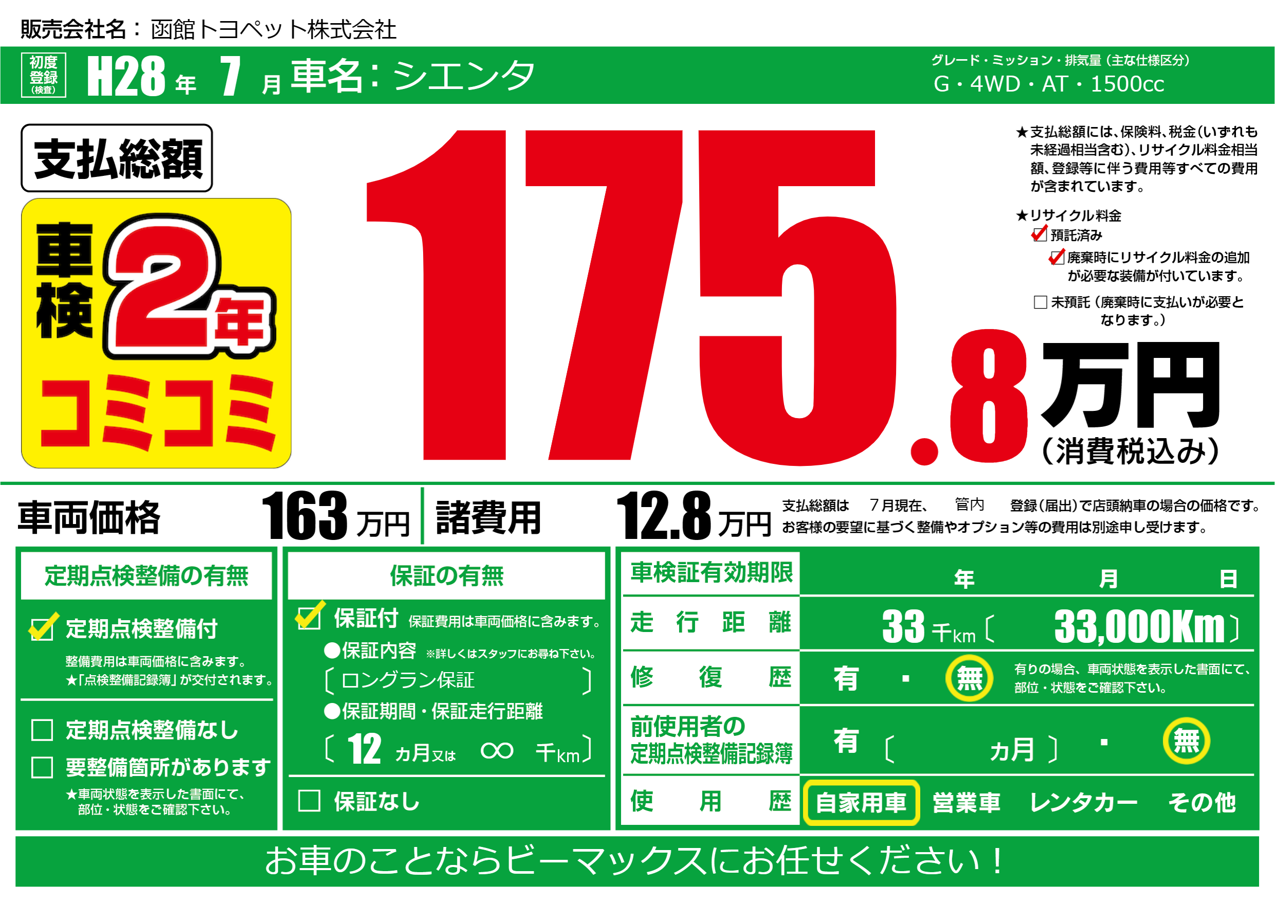 | 車名 | シエンタ | グレード ミッション 排気量 |