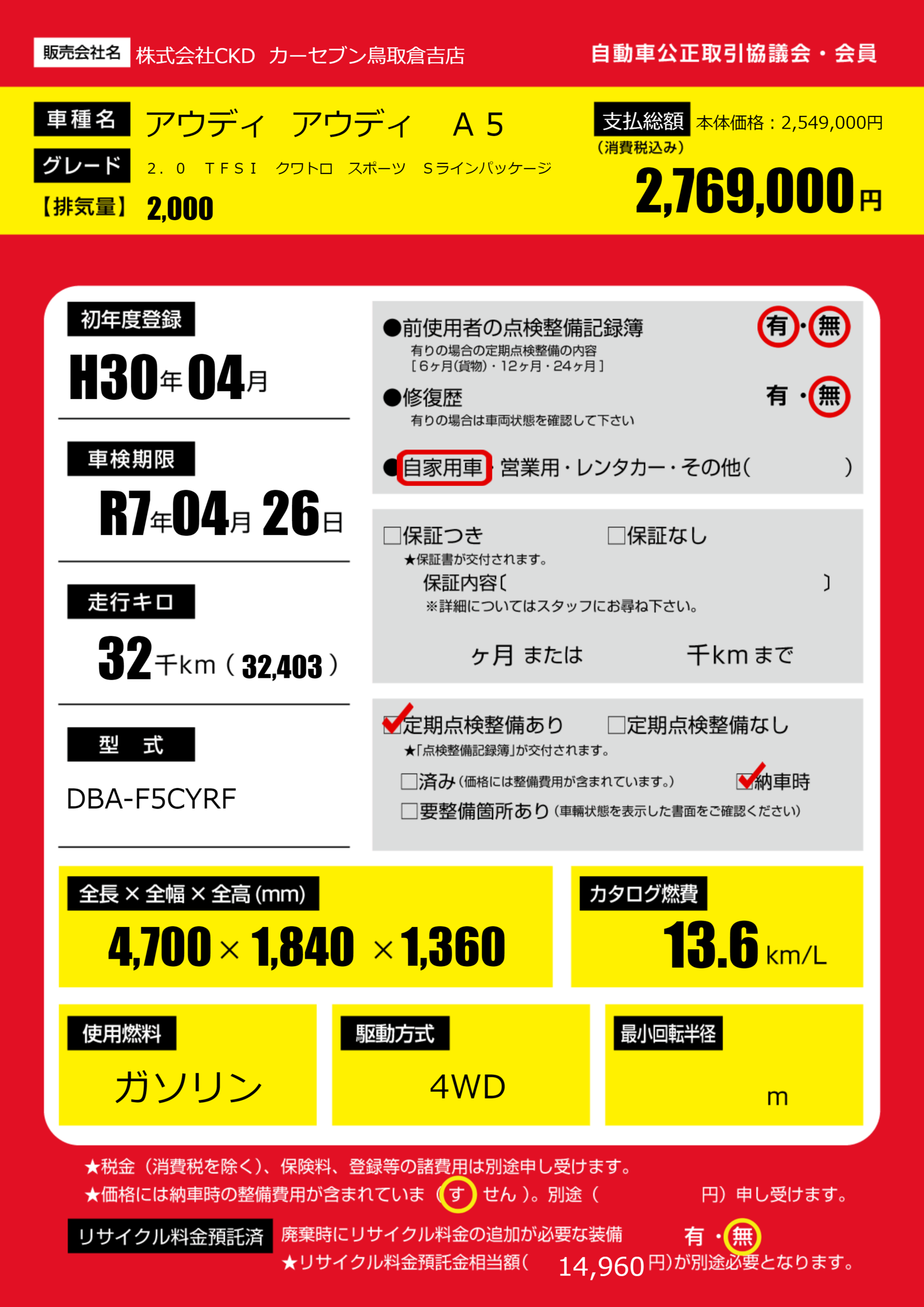 | 車名 | アウディ アウディ A5 | グレード ミッション 排気量 |