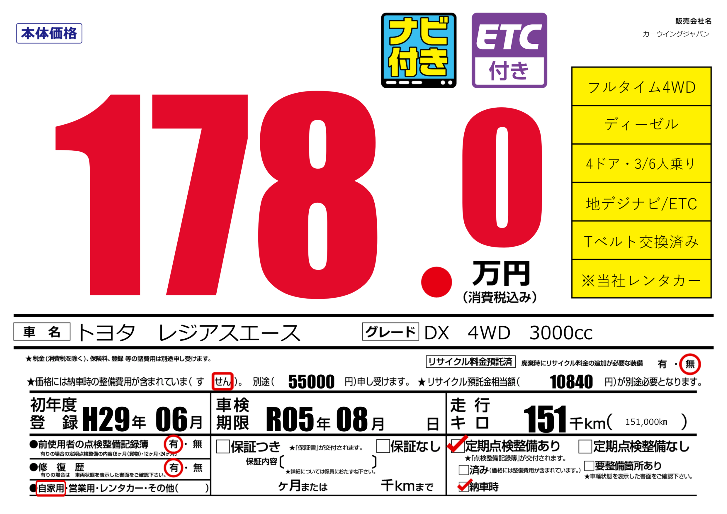 | 車名 | トヨタ レジアスエース | グレード ミッション 排気量 |