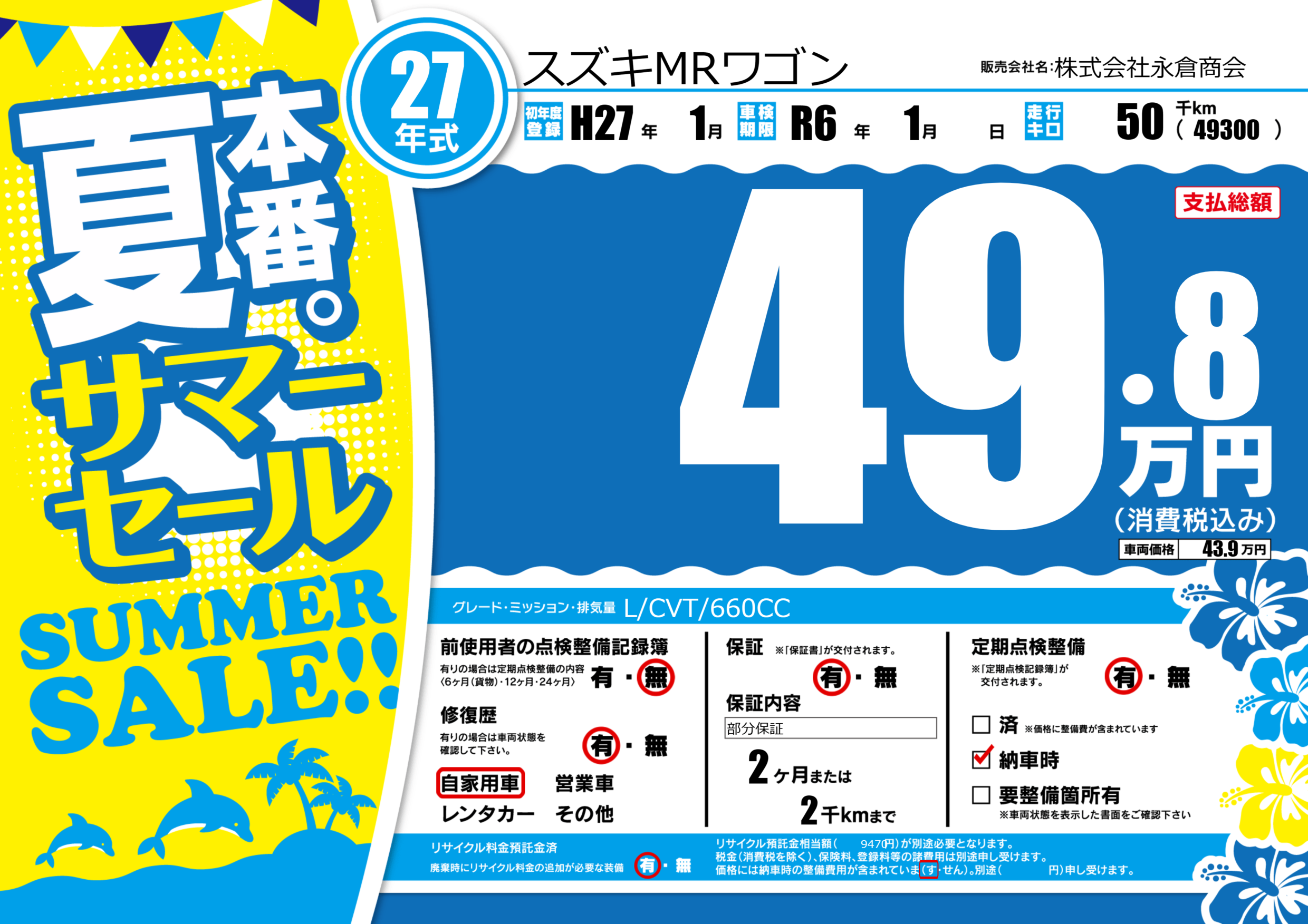 | 走行キロ | 5万km | 初年度登録 | H27年1月 |