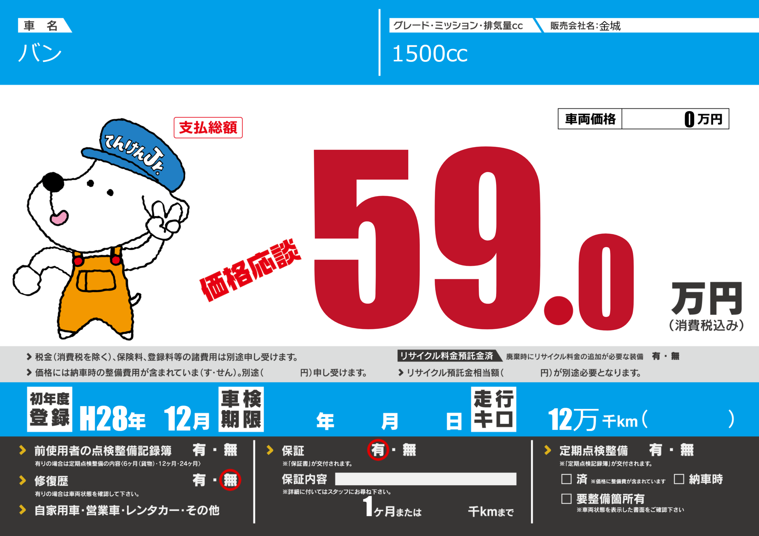 保証付き 保証内容(---) 1ヶ月または()千kmまで |