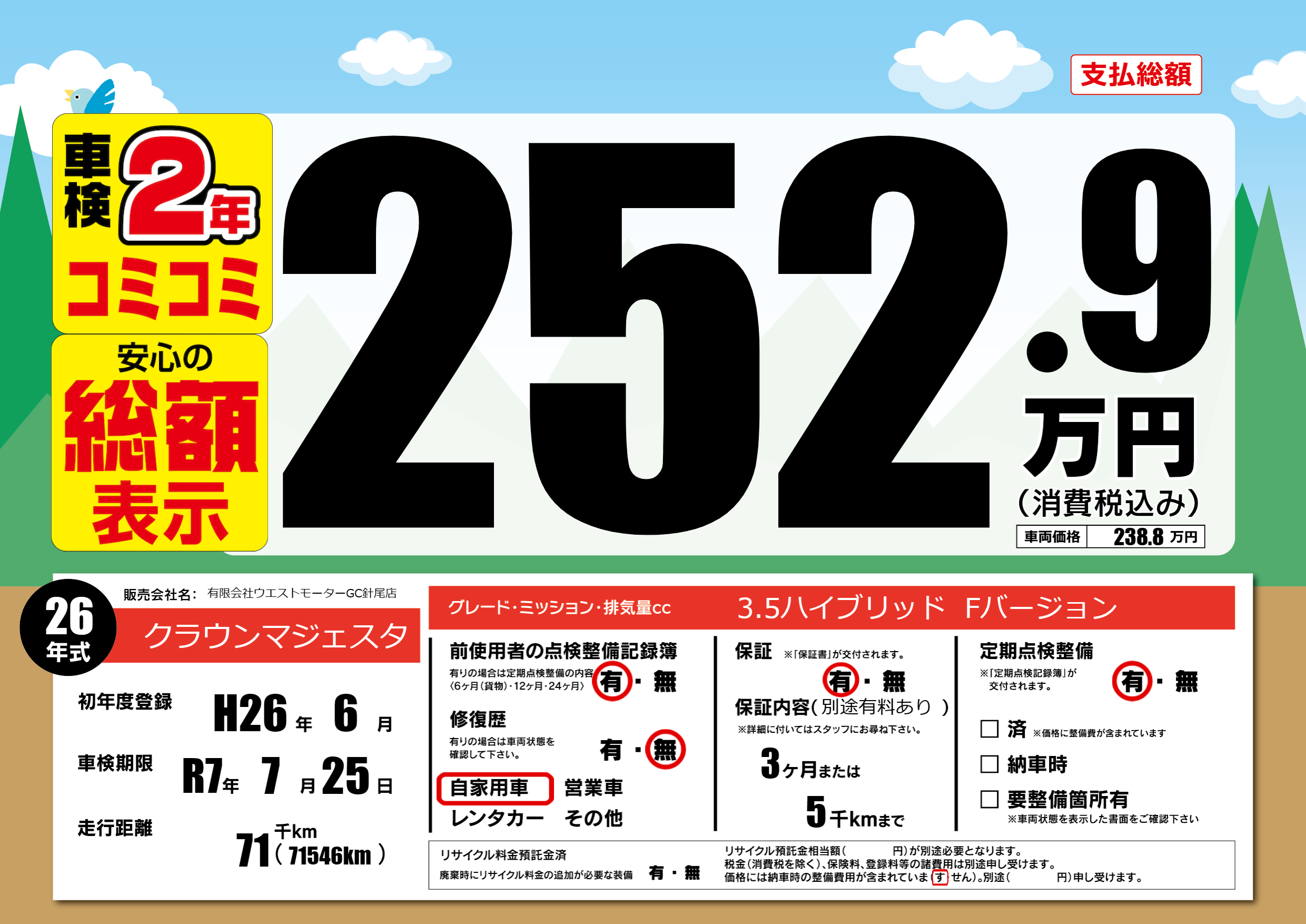 | 走行キロ | 7.1万km | 初年度登録 | H26年6月 |