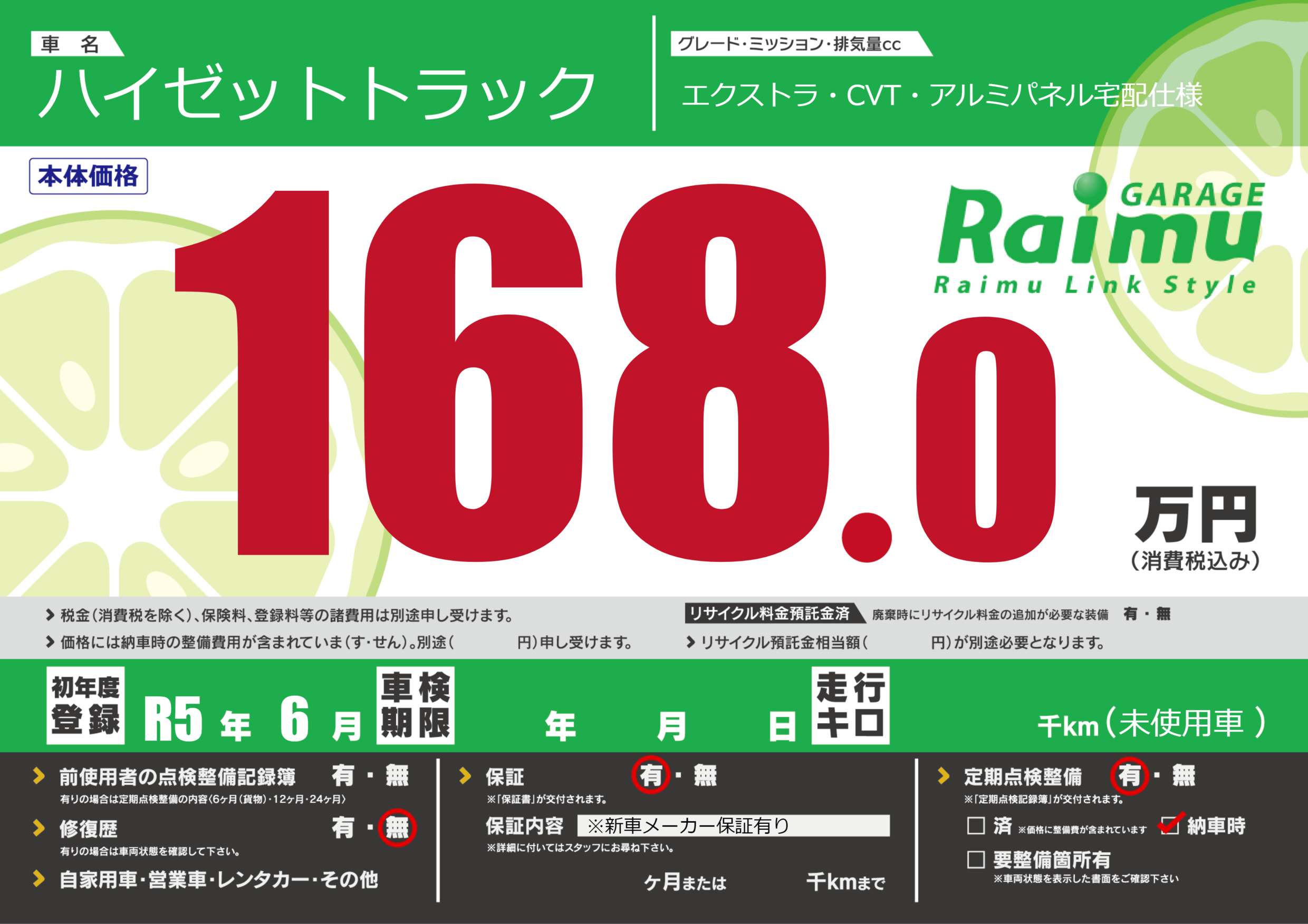 | 車名 | ハイゼットトラック | グレード ミッション 排気量 |