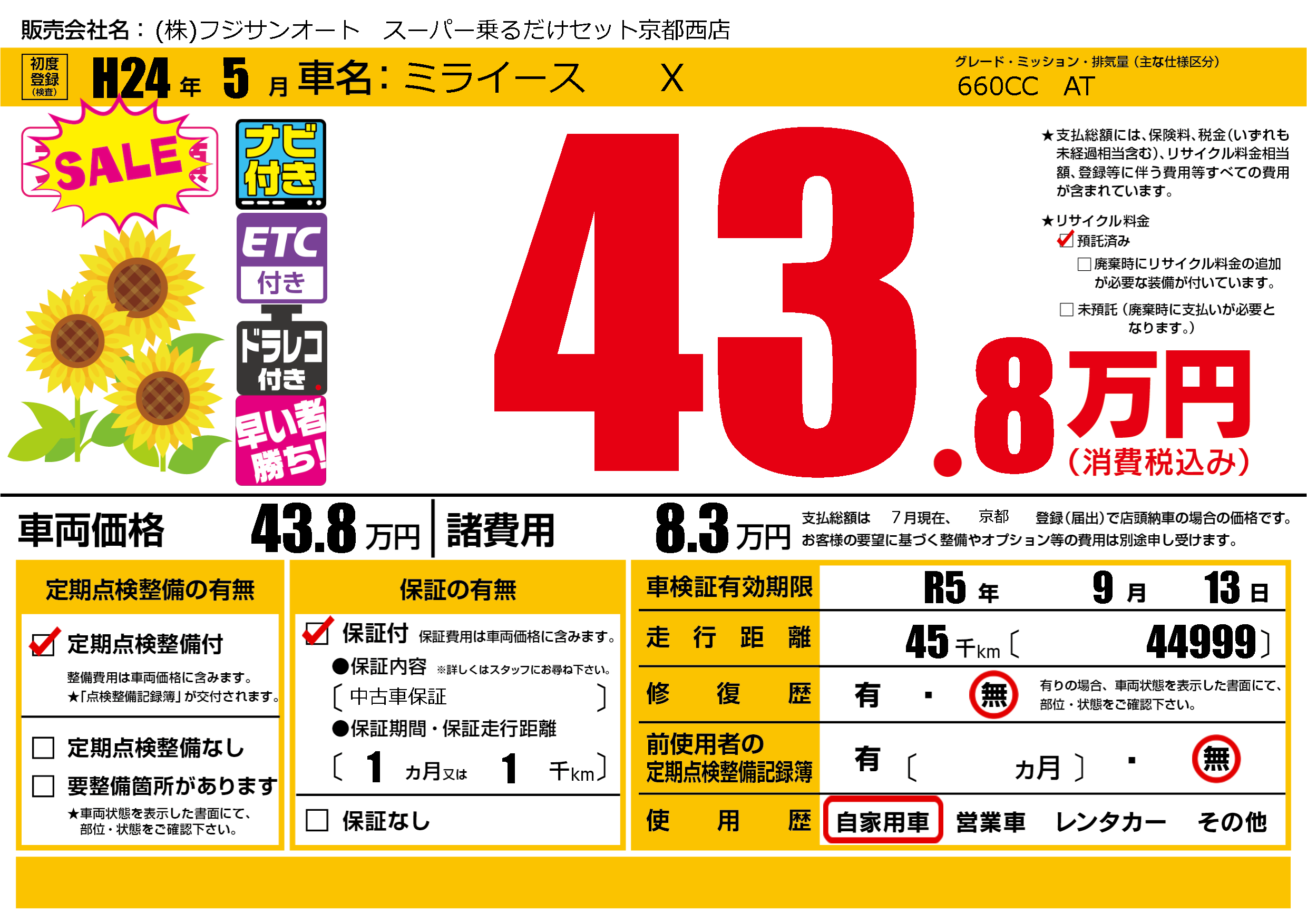 | 車名 | ミライース X | グレード ミッション 排気量 |