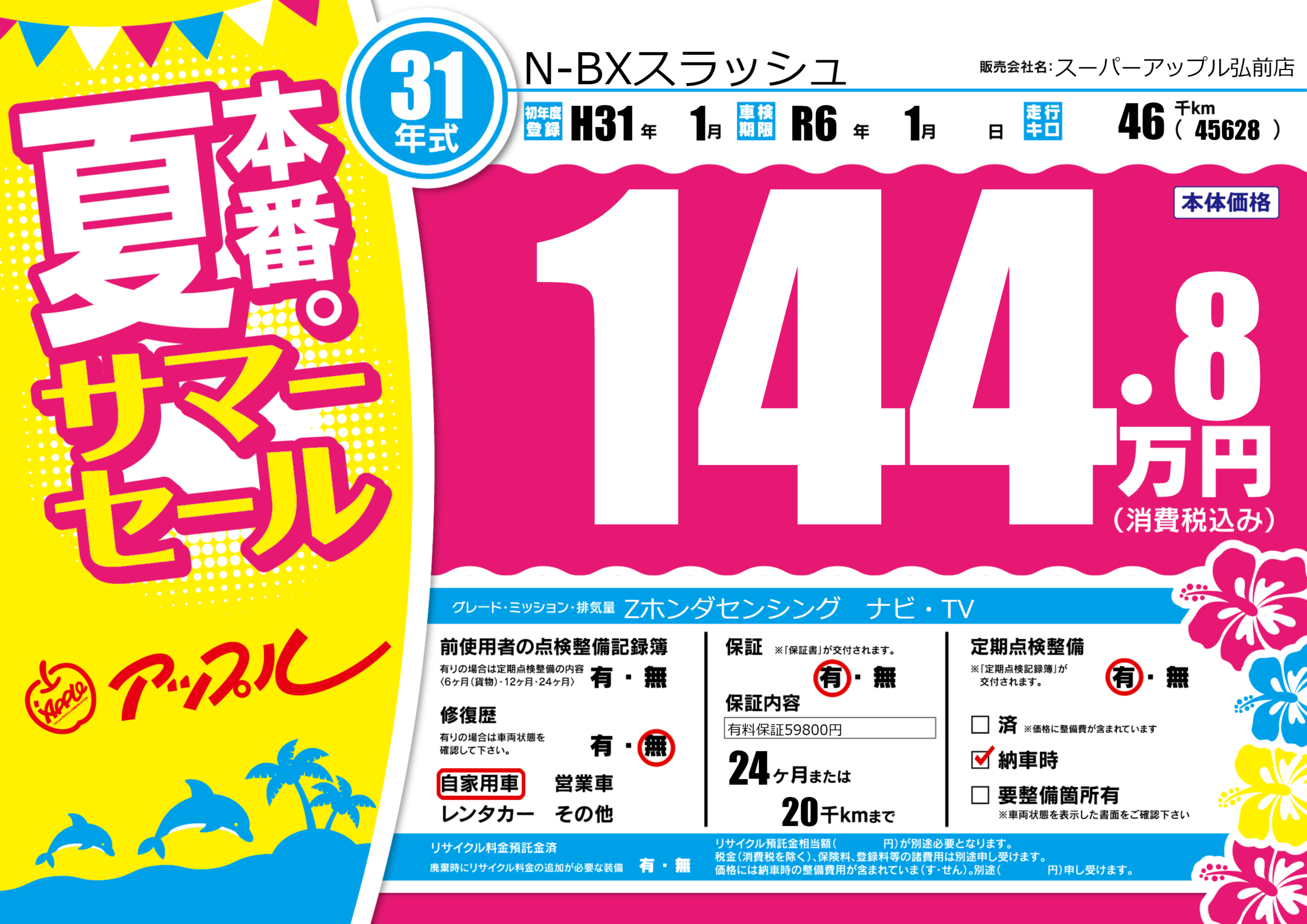 保証付き 保証内容(有料保証59800円) 24ヶ月または(20)千kmまで |