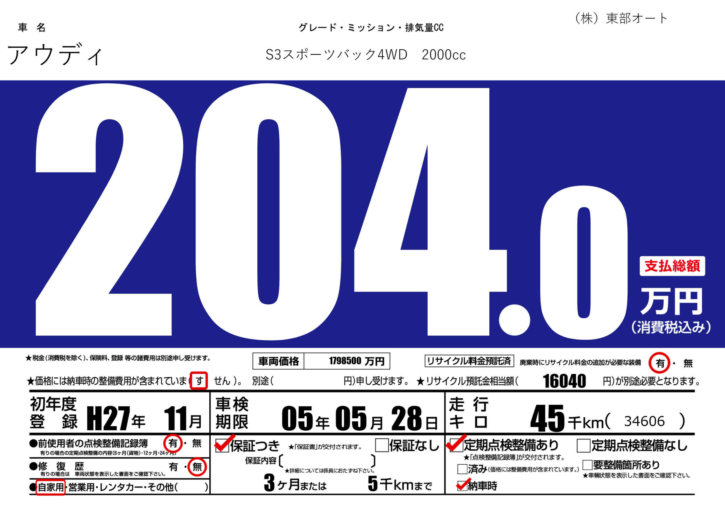 | 車名 | アウディ | グレード ミッション 排気量 |