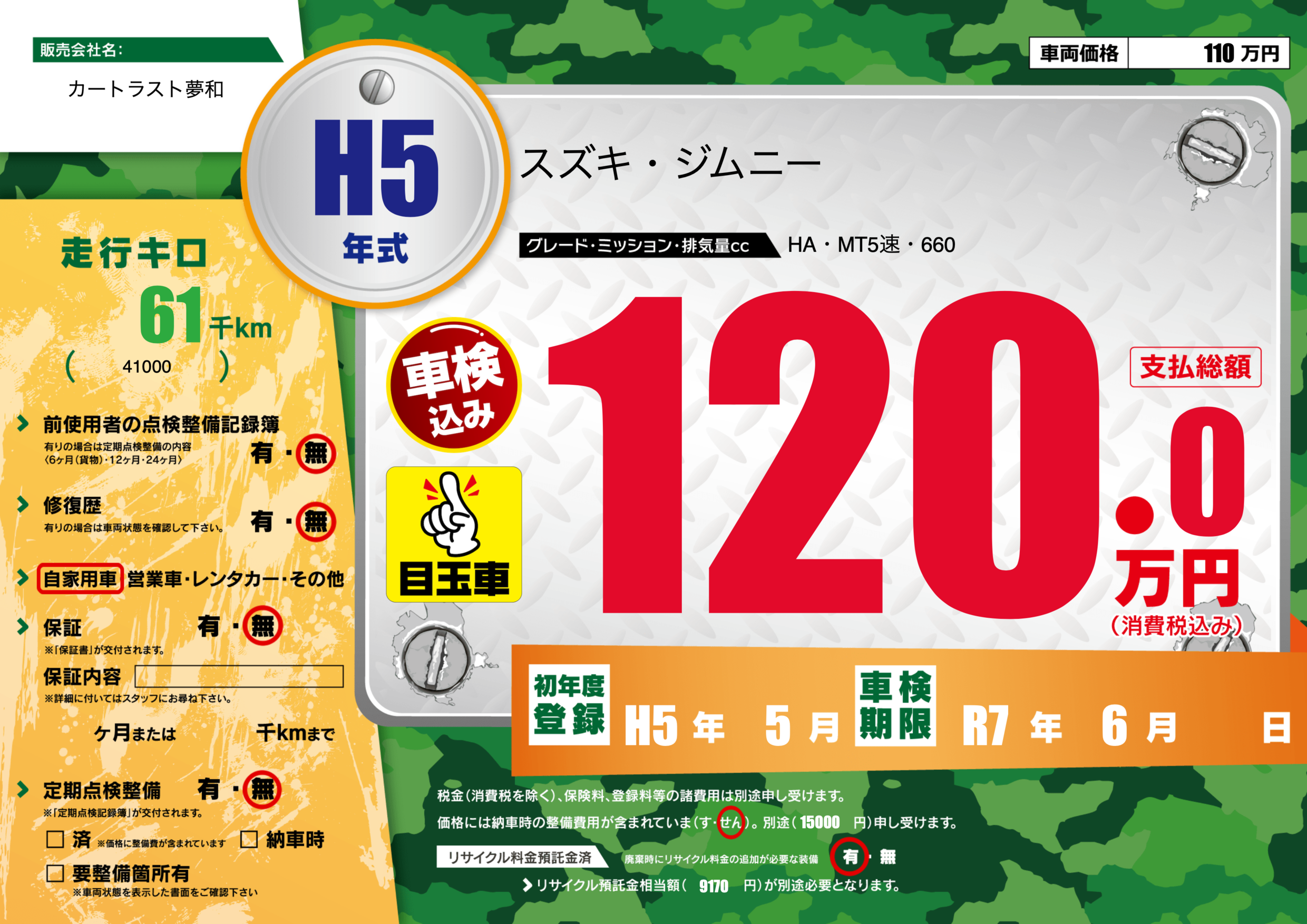 | 走行キロ | 6.1万km | 初年度登録 | H5年5月 |