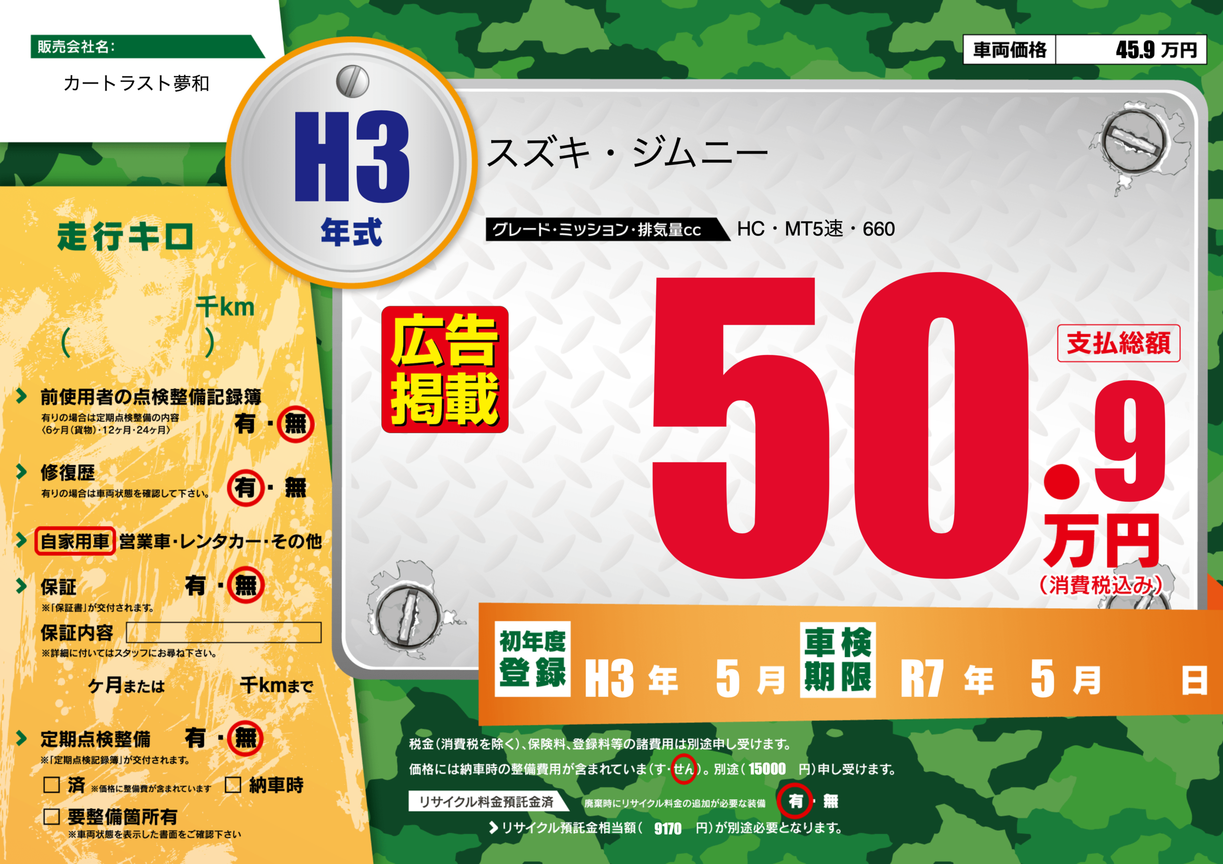 | 走行キロ | - | 初年度登録 | H3年5月 |