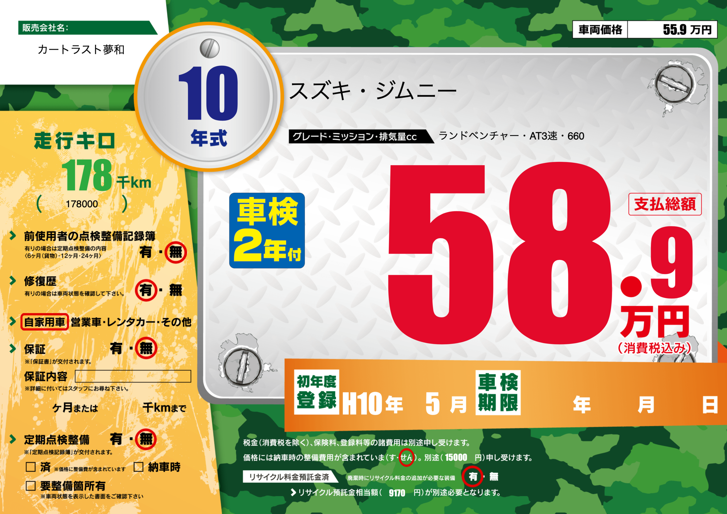 | 車名 | スズキ・ジムニー | グレード ミッション 排気量 |