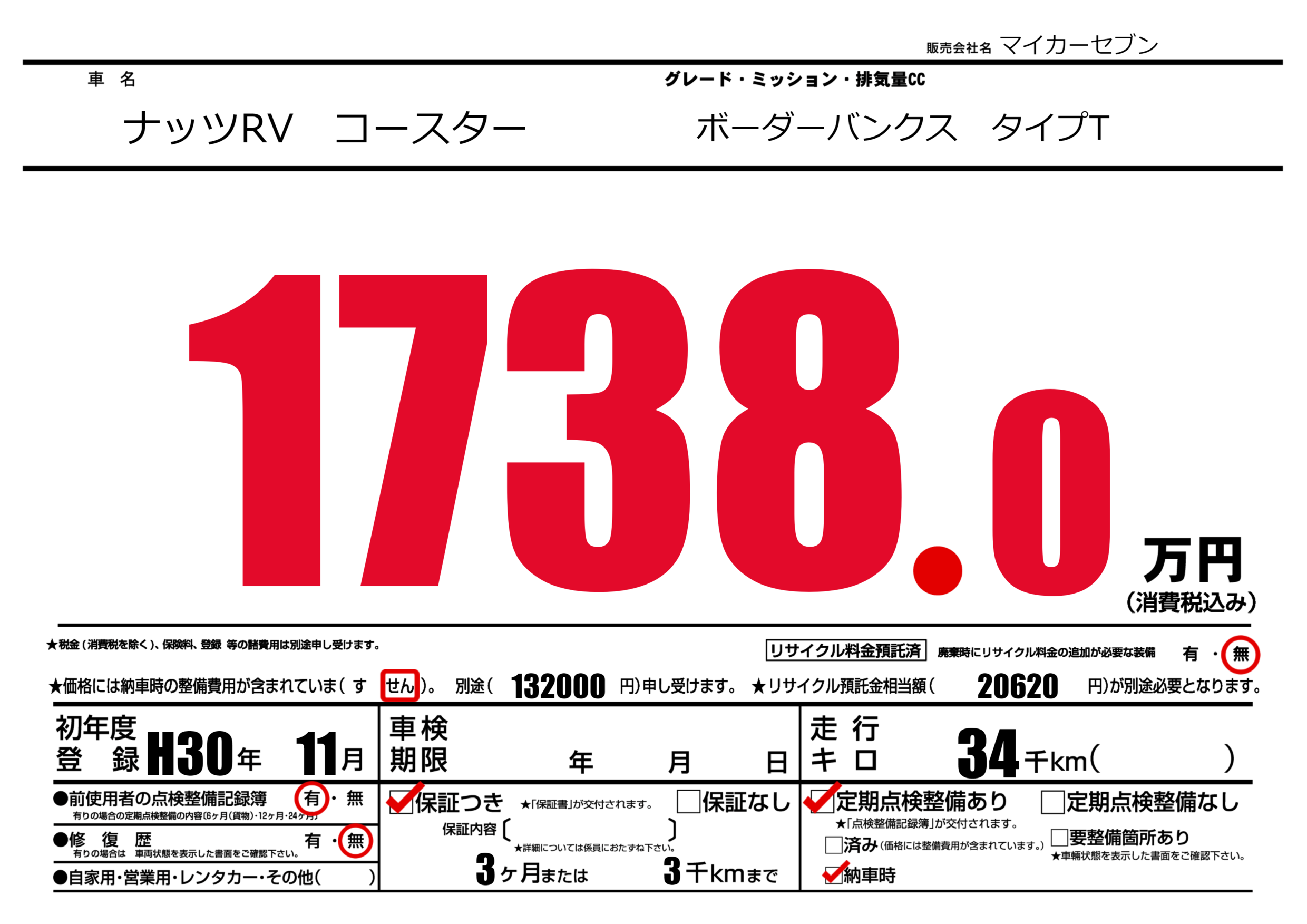 保証付き 保証内容(---) 3ヶ月または(3)千kmまで |
