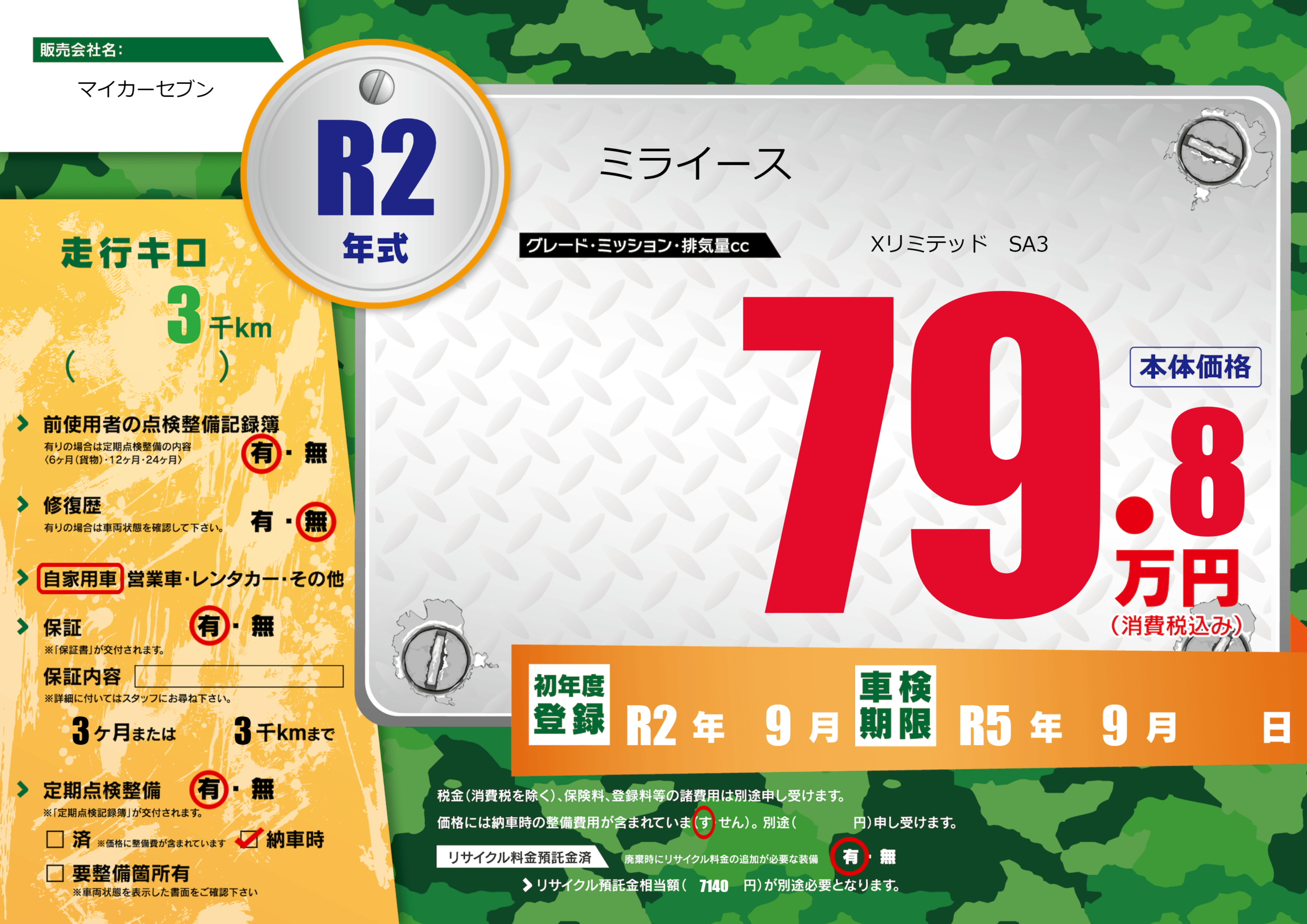 | 走行キロ | 0.3万km | 初年度登録 | R2年9月 |