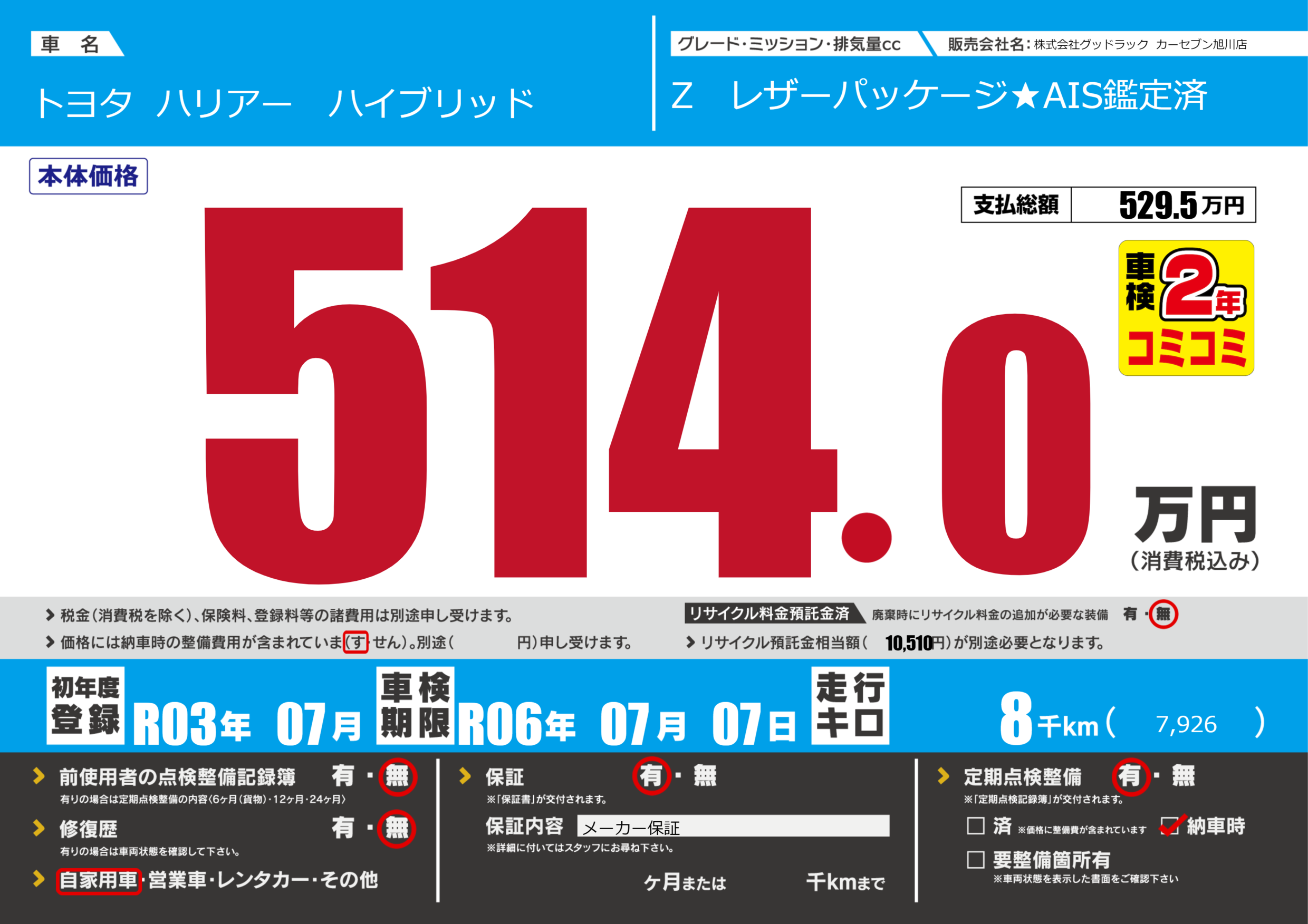 | 走行キロ | 0.8万km | 初年度登録 | R03年07月 |