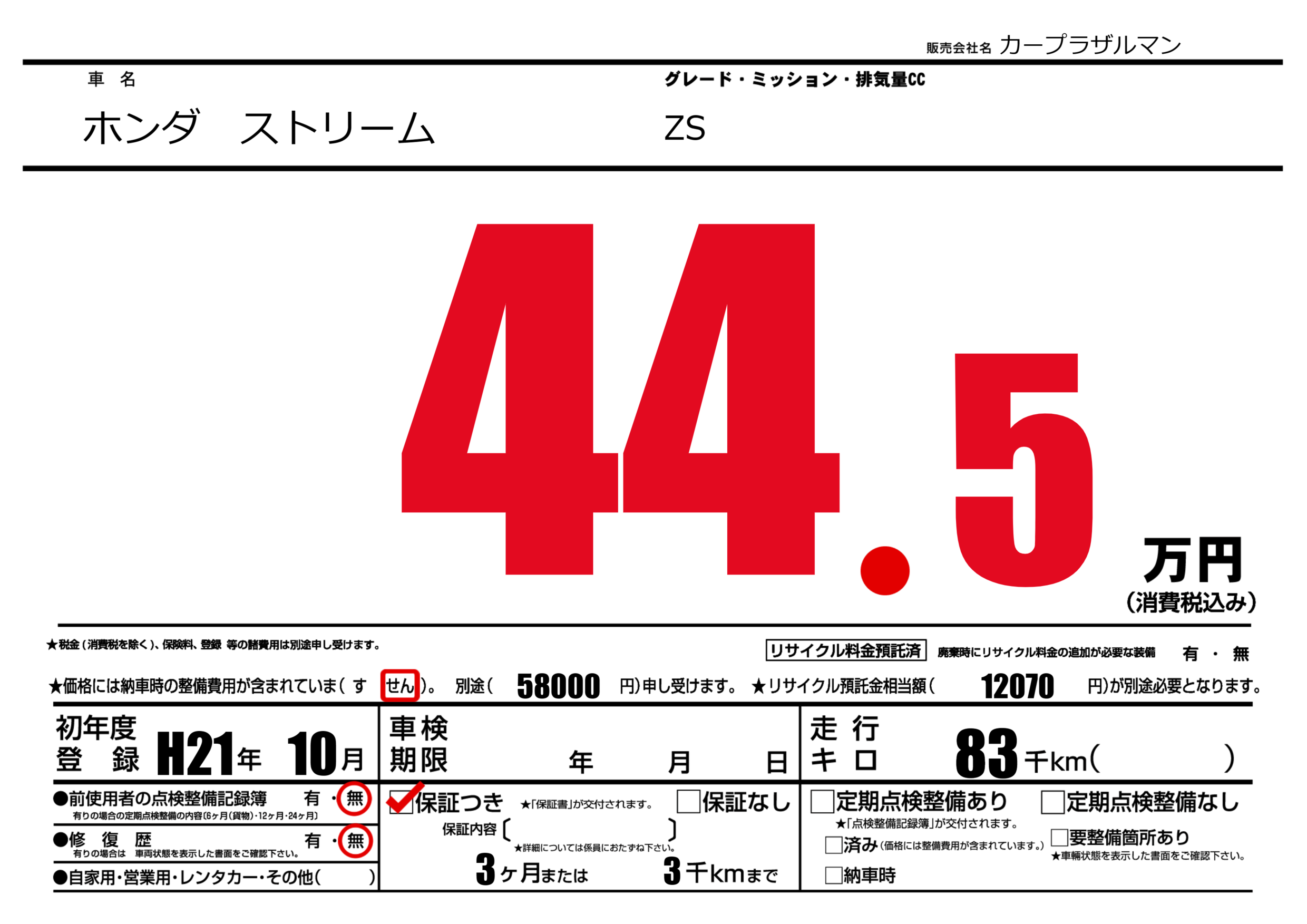 | 車名 | ホンダ ストリーム | グレード ミッション 排気量 |