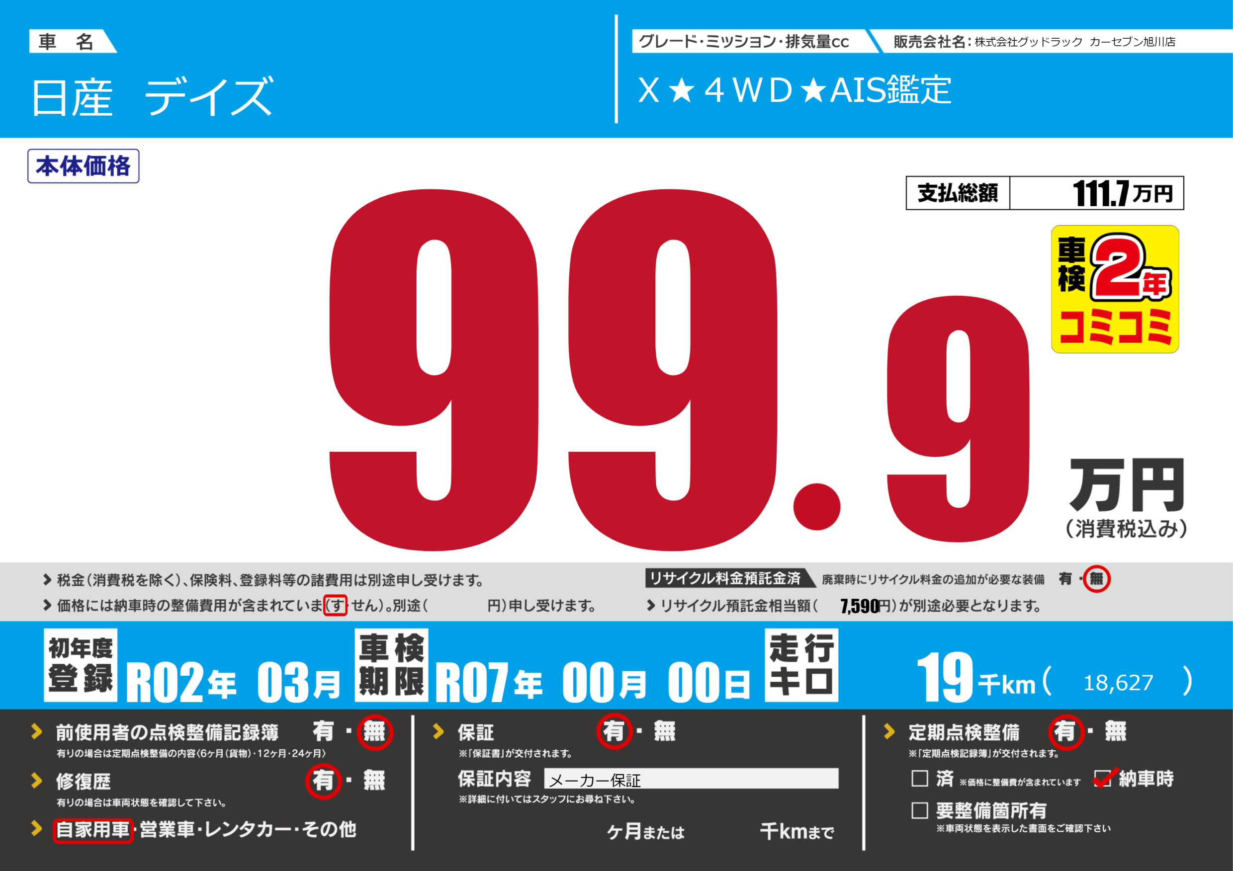 | 車名 | 日産 デイズ | グレード ミッション 排気量 |