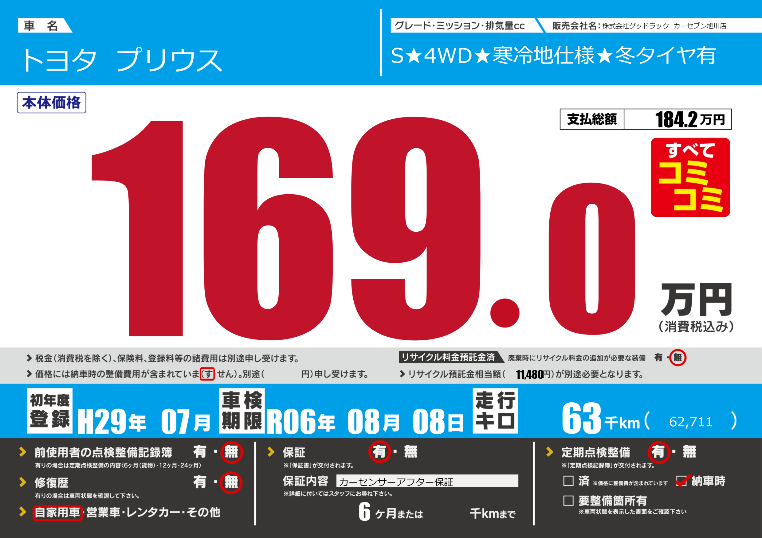 | 車名 | トヨタ プリウス | グレード ミッション 排気量 |