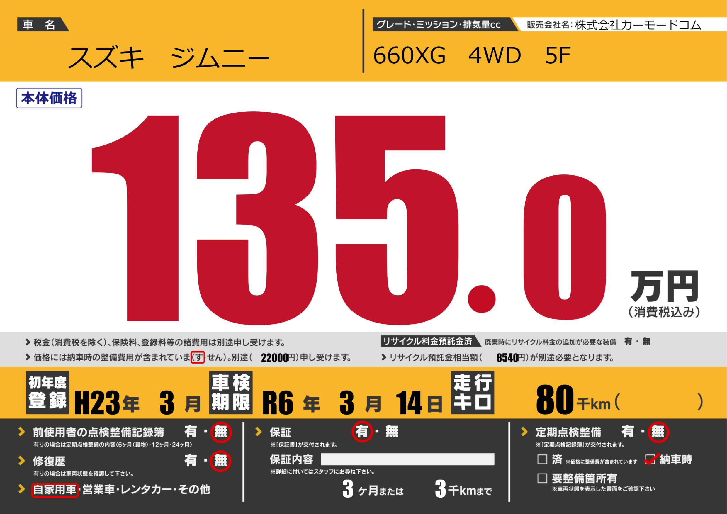 | 走行キロ | 8万km | 初年度登録 | H23年3月 |