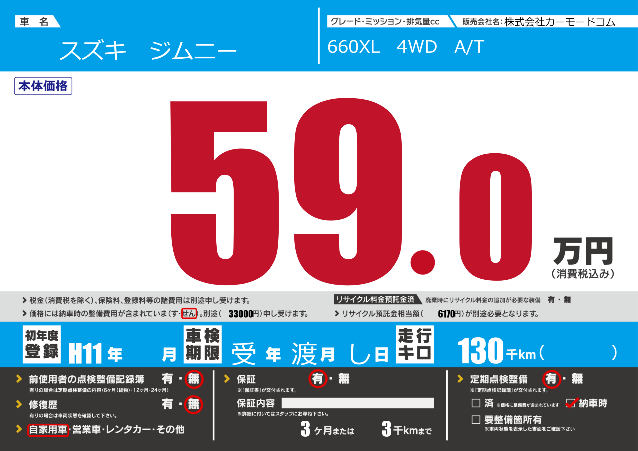 | 車名 | スズキ ジムニー | グレード ミッション 排気量 |