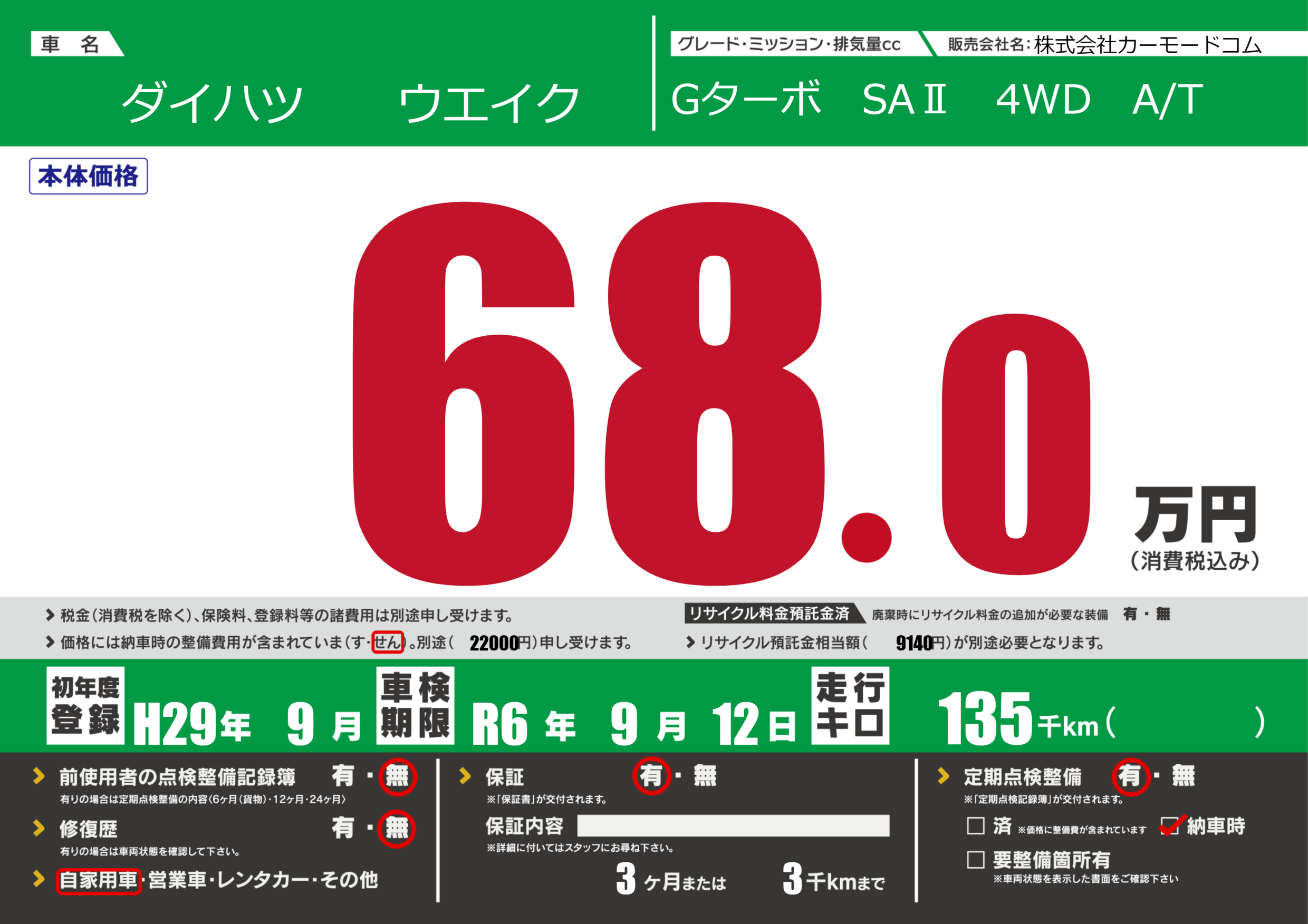 保証付き 保証内容(---) 3ヶ月または(3)千kmまで |