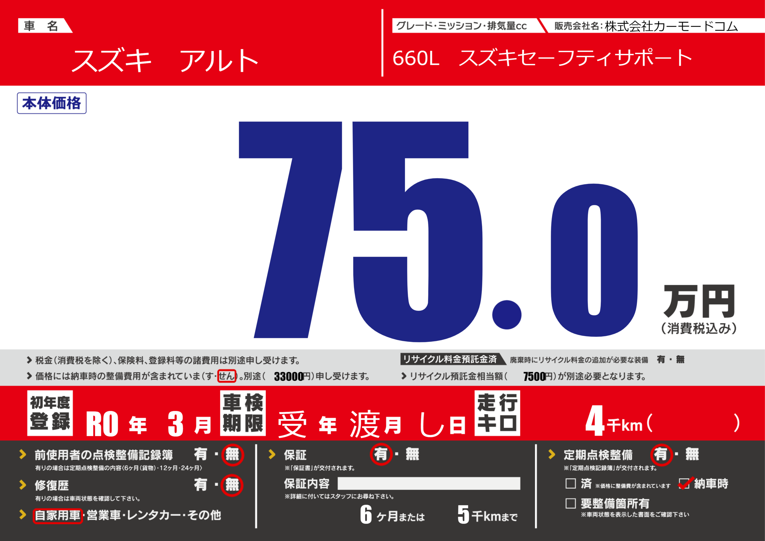 保証付き 保証内容(---) 6ヶ月または(5)千kmまで |