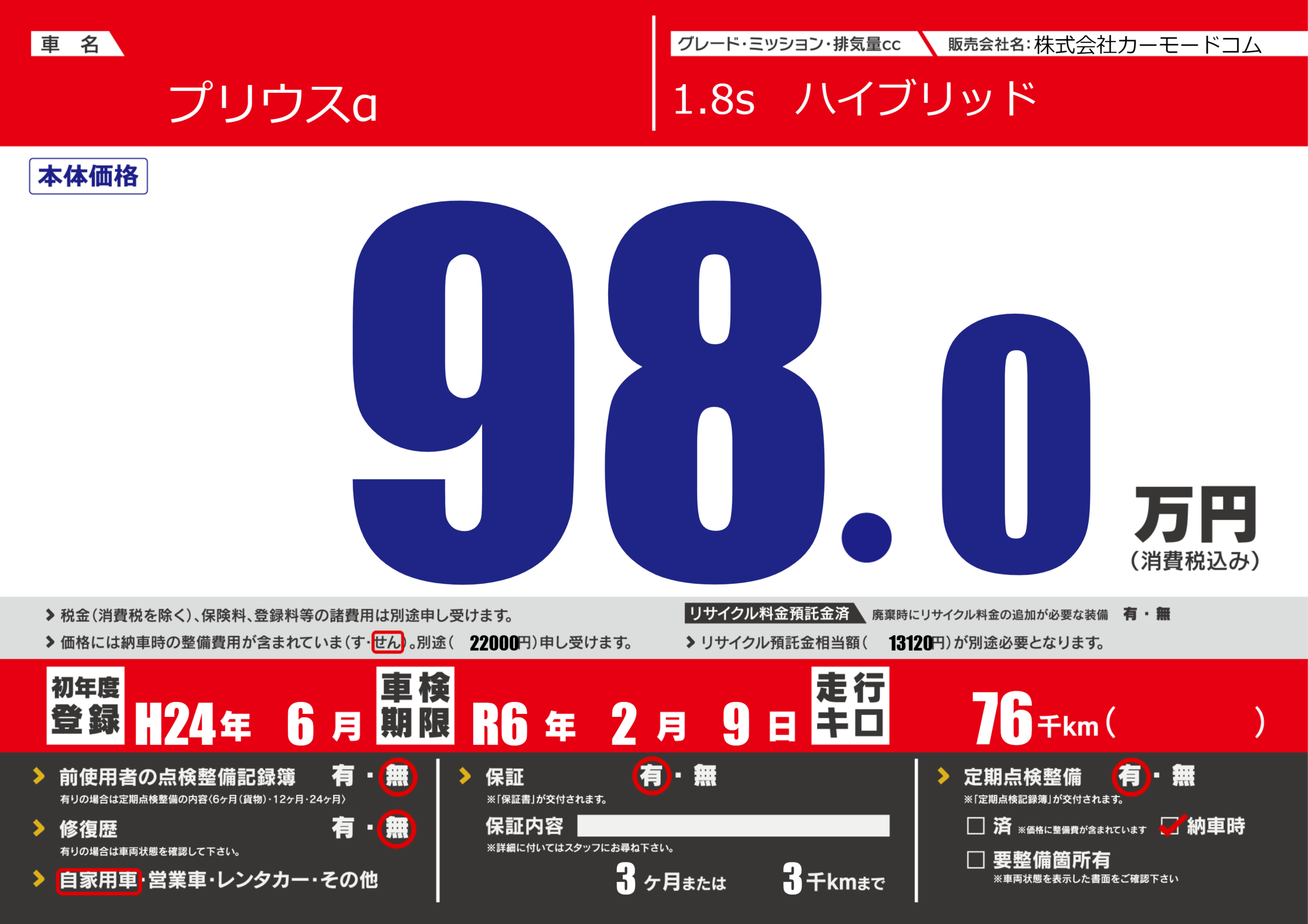 | 定期点検整備 | 定期点検整備あり 納車時あり | ||