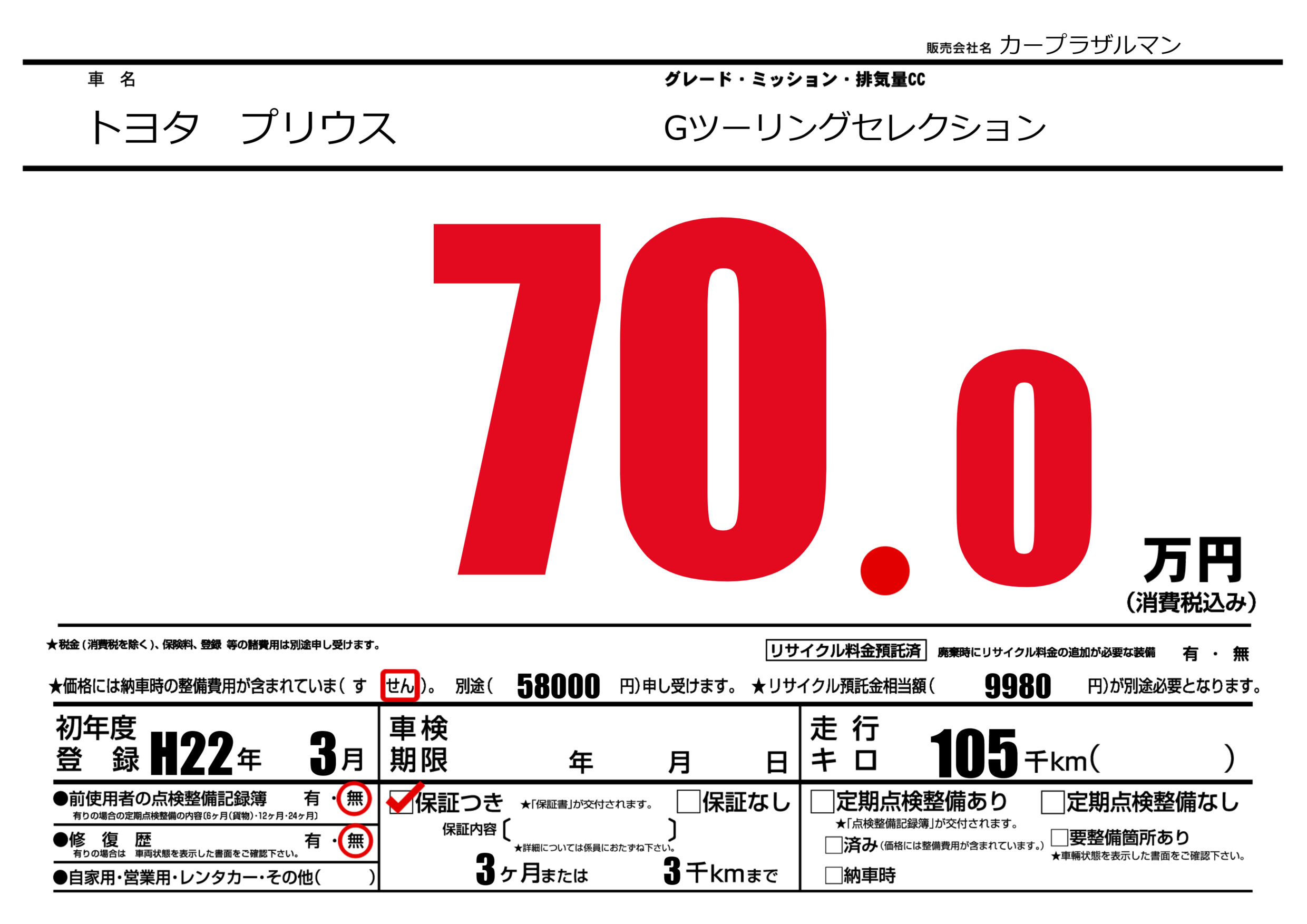 | 車名 | トヨタ プリウス | グレード ミッション 排気量 |
