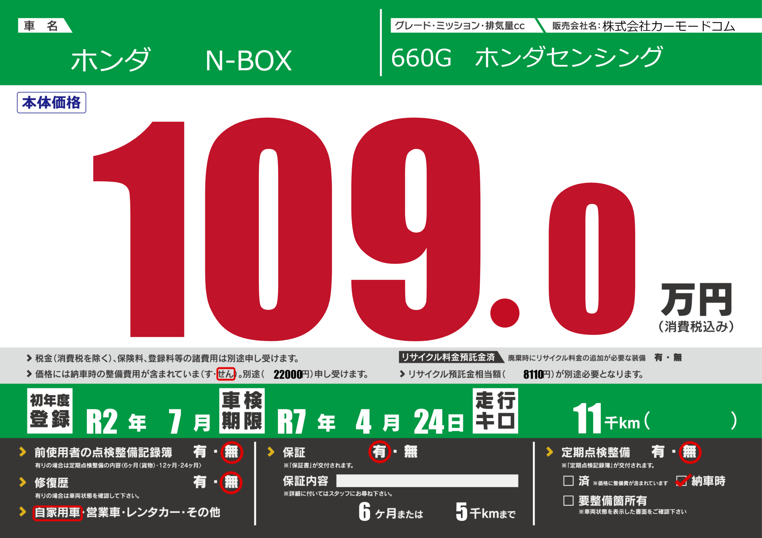 | 定期点検整備 | 定期点検整備なし 納車時あり | ||