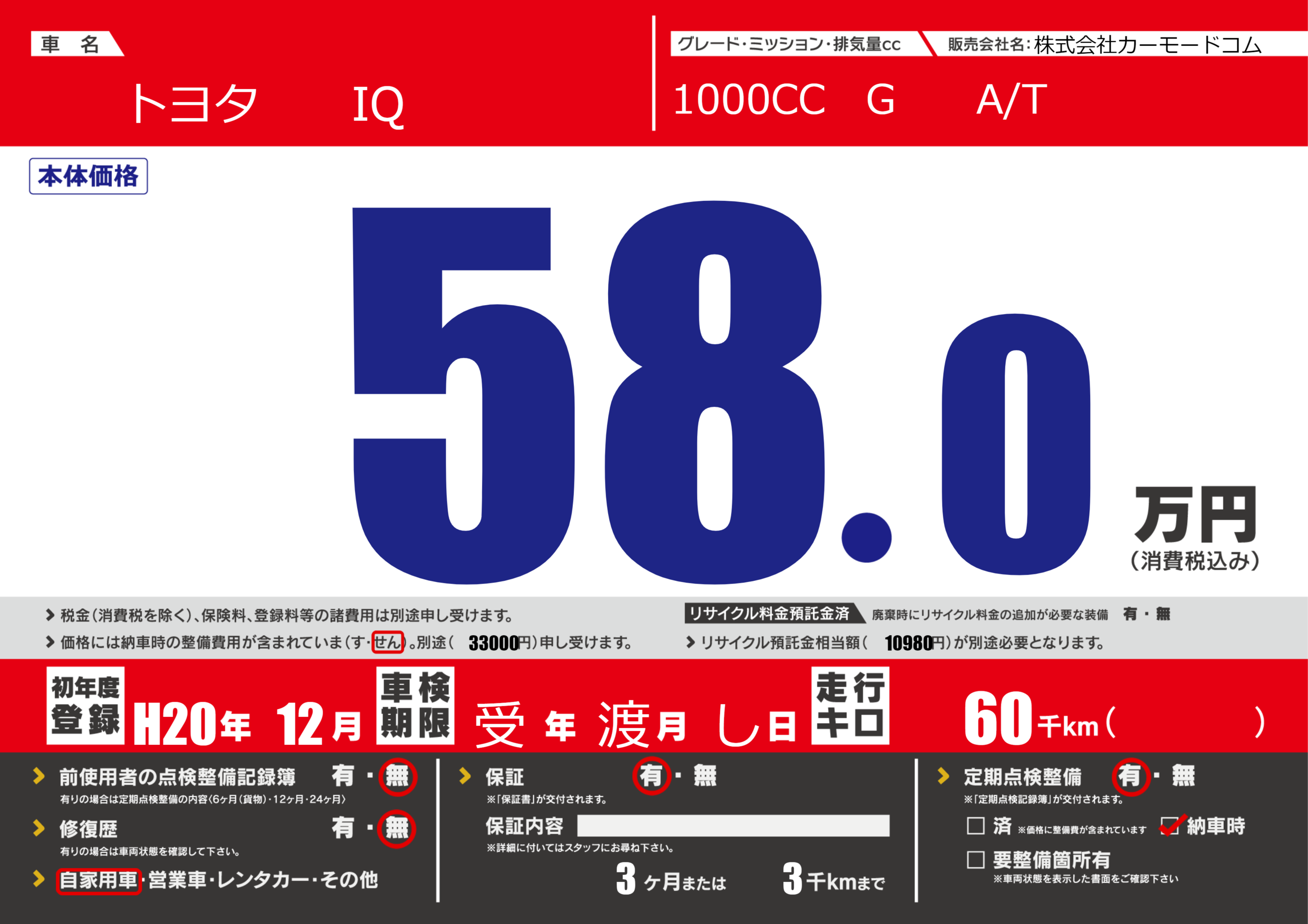 保証付き 保証内容(---) 3ヶ月または(3)千kmまで |