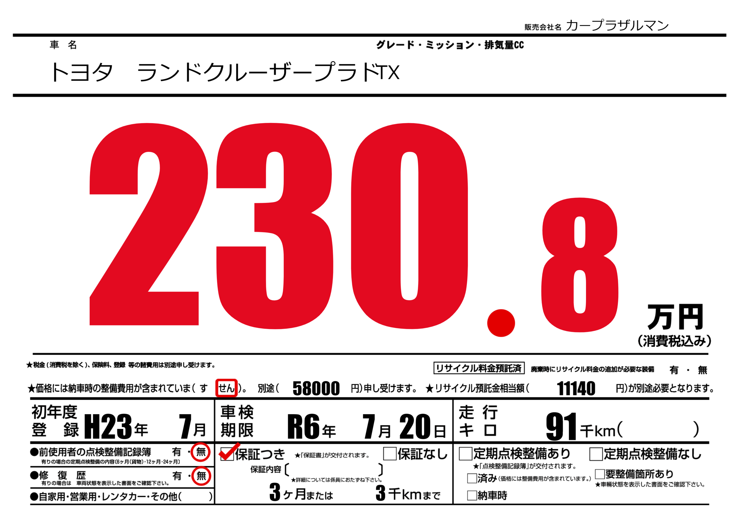 | 車名 | トヨタ ランドクルーザープラド | グレード ミッション 排気量 |