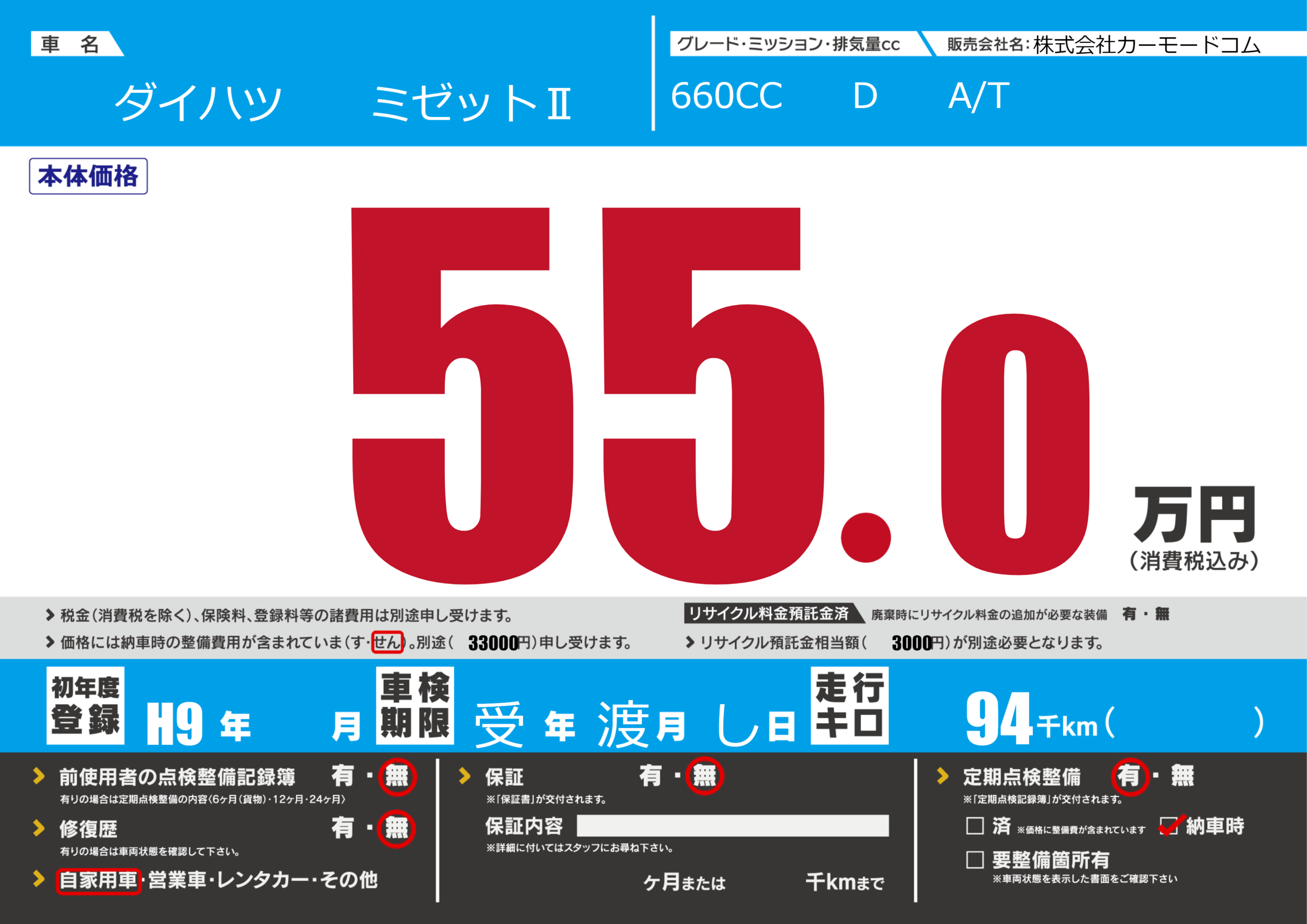 | 定期点検整備 | 定期点検整備あり 納車時あり | ||
